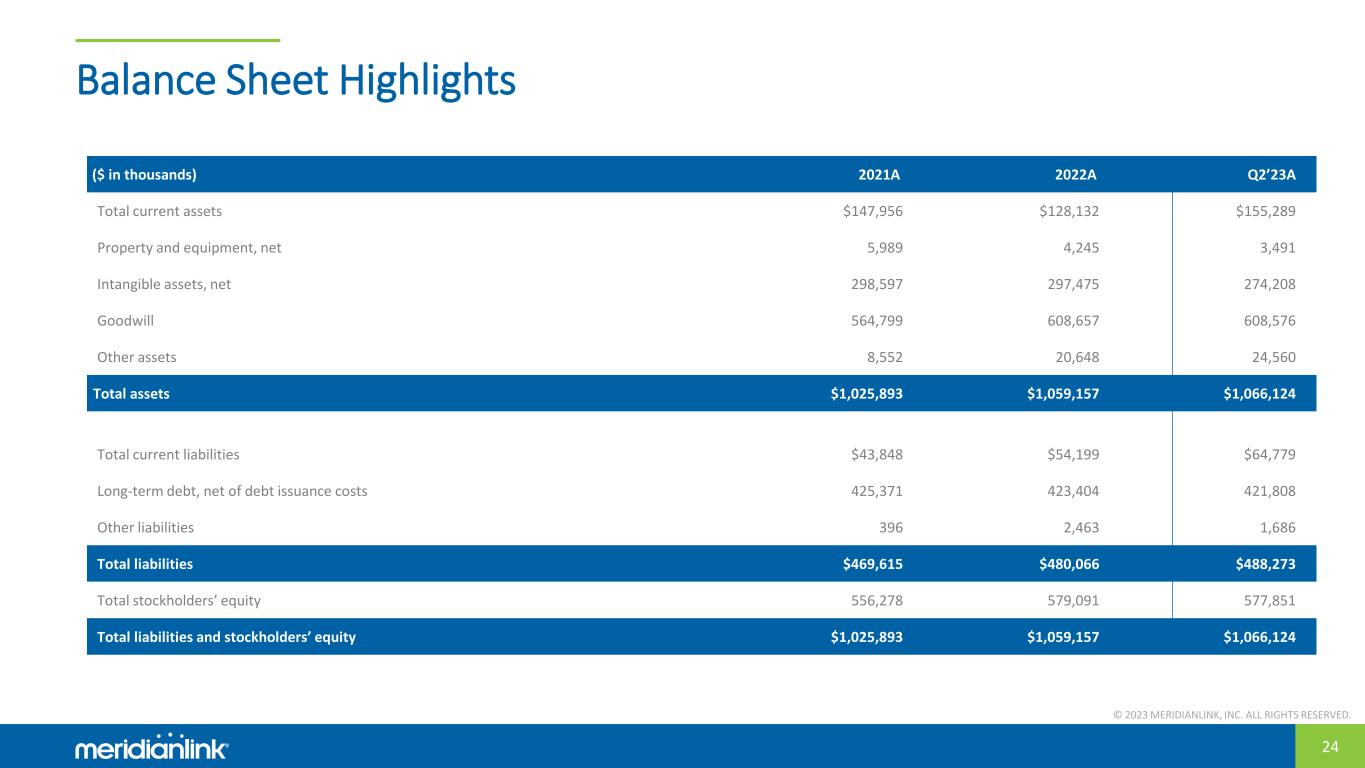 © 2023 MERIDIANLINK, INC. ALL RIGHTS RESERVED. 23 Financial Reconciliations (Cont’d) ($ in thousands) 2021A 2022A Q2’23A Sales and marketing $18,122 $23,658 $8,558 (-) Share-based compensation expense 2,247 2,160 1,104 (-) Employer payroll taxes on employee stock transactions 11 40 30 Non-GAAP sales and marketing $15,864 $21,458 $7,424 GAAP sales and marketing as a % of revenue 7% 8% 11% Non-GAAP sales and marketing as a % of revenue 6% 7% 10% Non-GAAP Sales and Marketing Expense ($ in thousands) 2021A 2022A Q2’23A Research and development $36,336 $42,592 $11,754 (-) Share-based compensation expense 7,453 6,472 1,875 (-) Employer payroll taxes on employee stock transactions 8 102 97 Non-GAAP research and development $28,875 $36,018 $9,782 GAAP research and development as a % of revenue 14% 15% 16% Non-GAAP research and development as a % of revenue 11% 13% 13% Non-GAAP Research and Development Expense ($ in thousands) 2021A 2022A Q2’23A General and administrative $85,160 $82,649 $24,409 (-) Share-based compensation expense 14,558 9,499 5,231 (-) Employer payroll taxes on employee stock transactions 73 81 107 (-) Depreciation expense 2,303 2,319 495 (-) Amortization of intangibles 35,631 36,110 9,419 Non-GAAP general and administrative $32,595 $34,640 $9,157 GAAP general and administrative as a % of revenue 32% 29% 32% Non-GAAP general and administrative as a % of revenue 12% 12% 12% Non-GAAP General and Administrative Expense