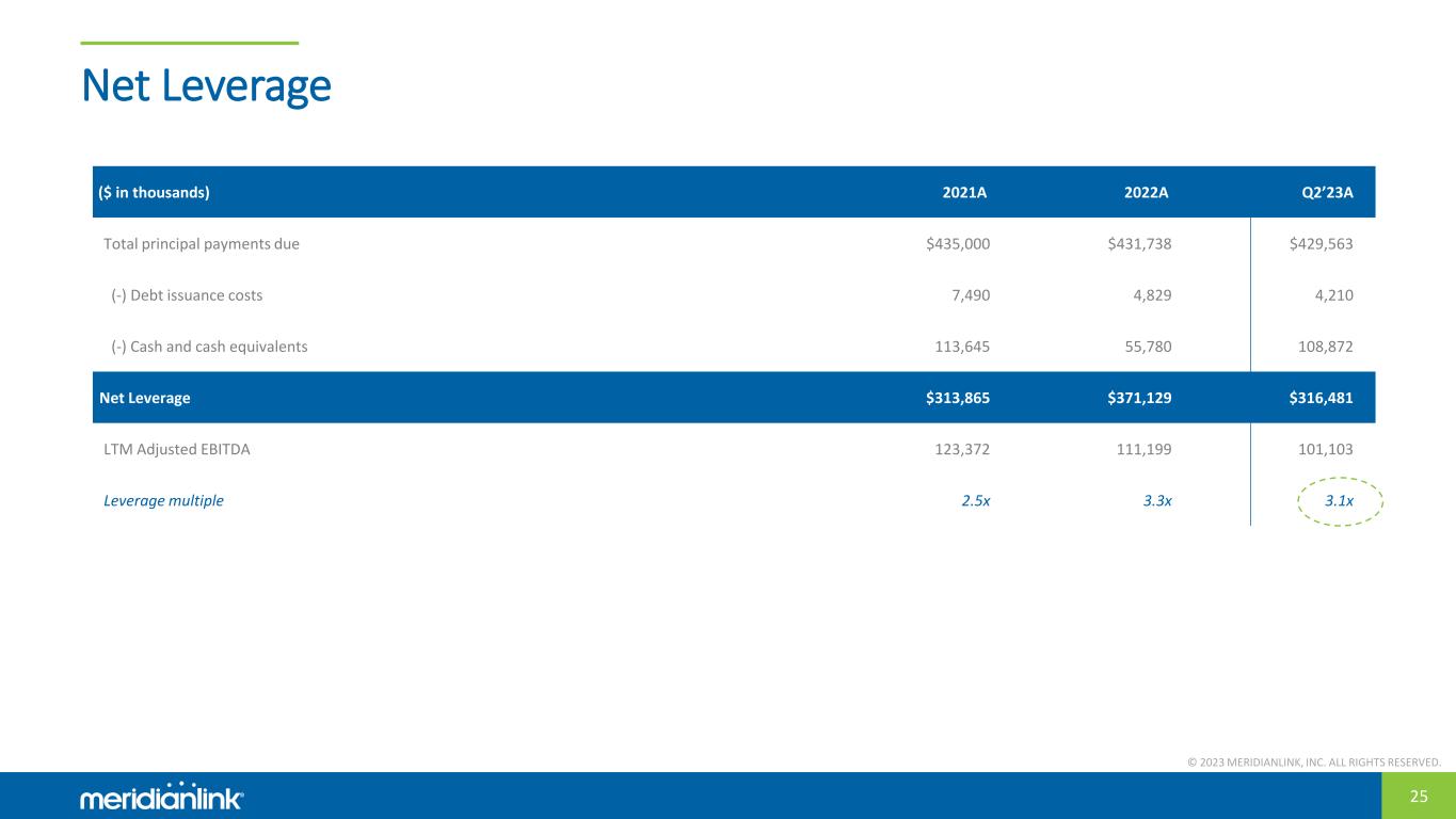 © 2023 MERIDIANLINK, INC. ALL RIGHTS RESERVED. 24 Balance Sheet Highlights ($ in thousands) 2021A 2022A Q2’23A Total current assets $147,956 $128,132 $155,289 Property and equipment, net 5,989 4,245 3,491 Intangible assets, net 298,597 297,475 274,208 Goodwill 564,799 608,657 608,576 Other assets 8,552 20,648 24,560 Total assets $1,025,893 $1,059,157 $1,066,124 Total current liabilities $43,848 $54,199 $64,779 Long-term debt, net of debt issuance costs 425,371 423,404 421,808 Other liabilities 396 2,463 1,686 Total liabilities $469,615 $480,066 $488,273 Total stockholders’ equity 556,278 579,091 577,851 Total liabilities and stockholders’ equity $1,025,893 $1,059,157 $1,066,124