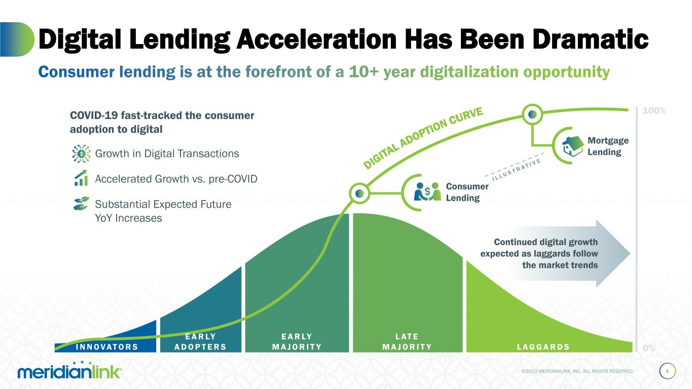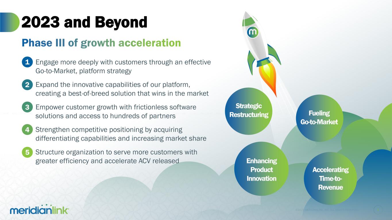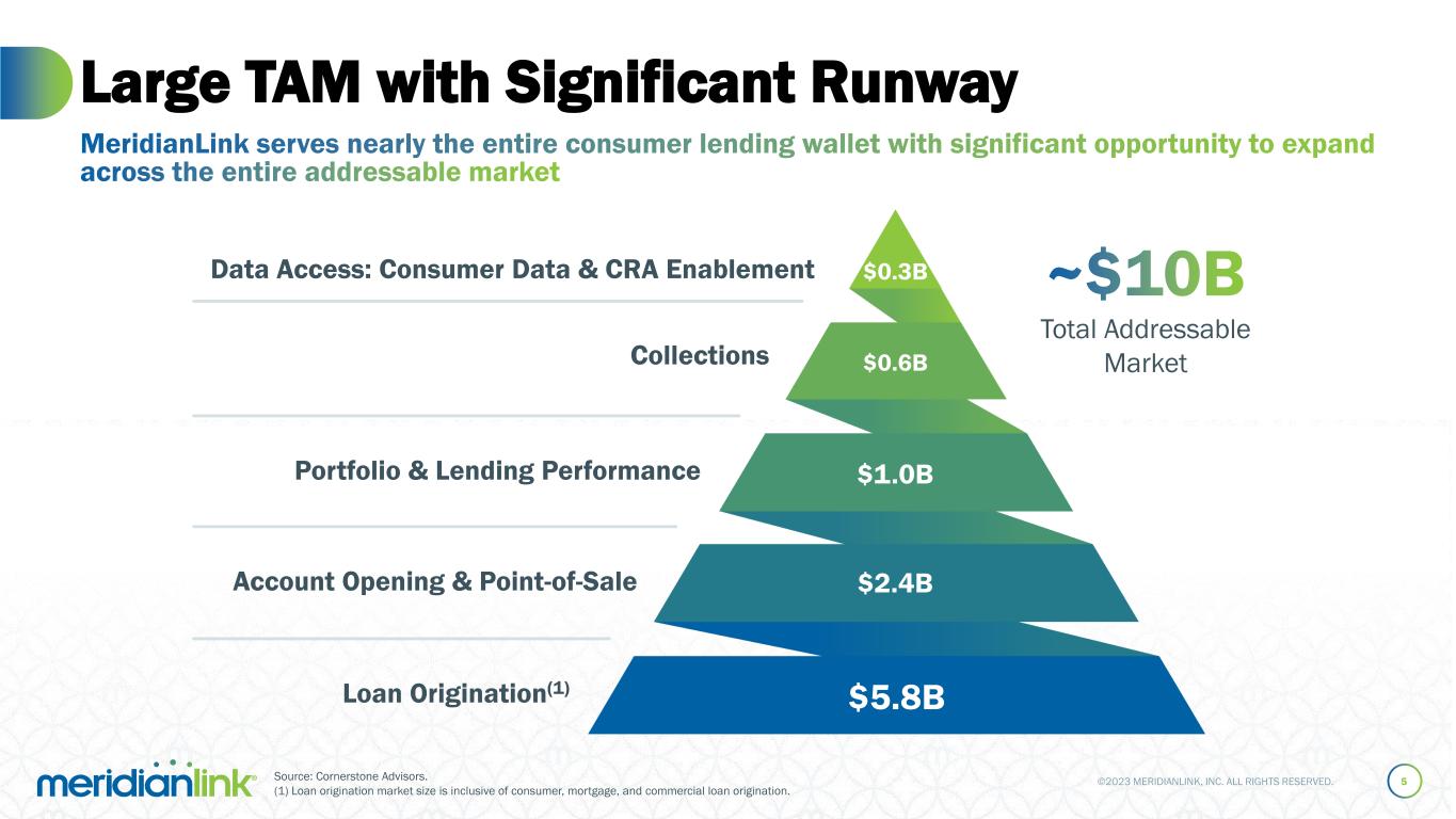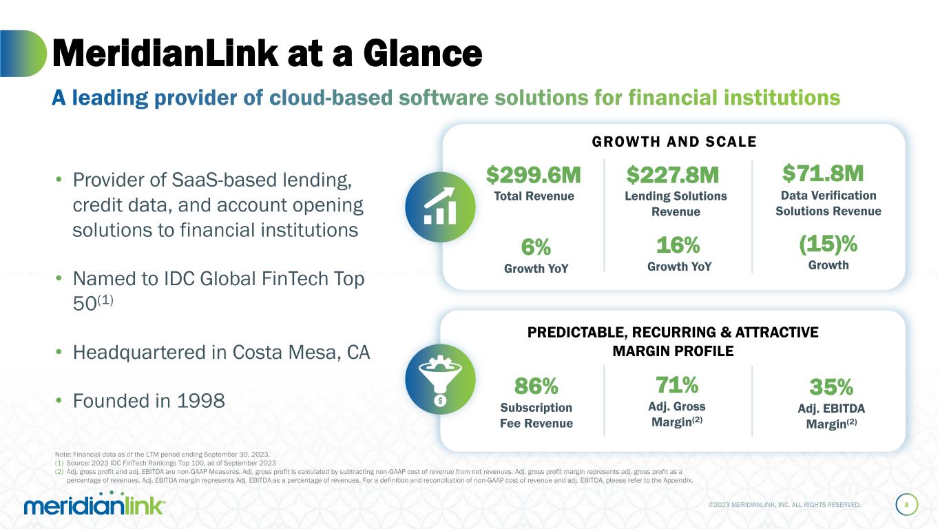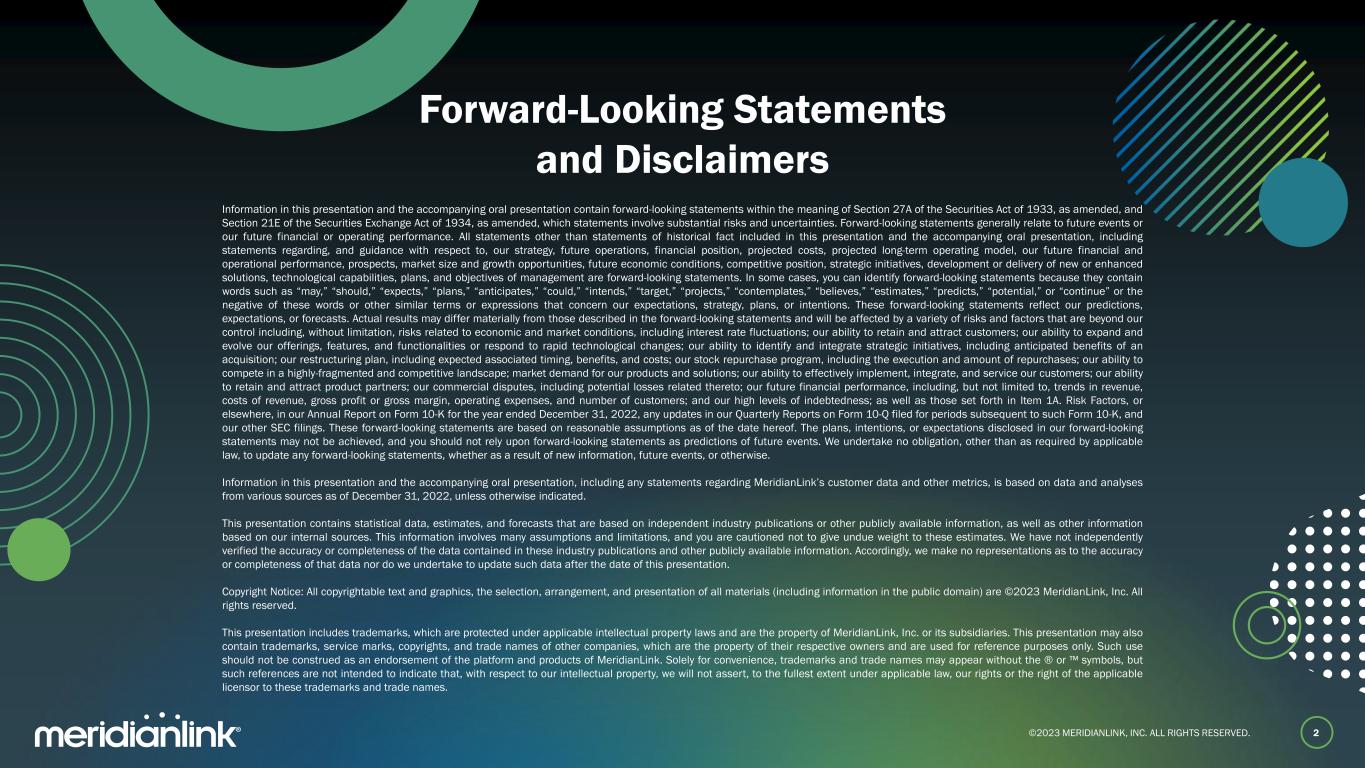 ©2023 MERIDIANLINK, INC. ALL RIGHTS RESERVED. Information in this presentation and the accompanying oral presentation contain forward-looking statements within the meaning of Section 27A of the Securities Act of 1933, as amended, and Section 21E of the Securities Exchange Act of 1934, as amended, which statements involve substantial risks and uncertainties. Forward-looking statements generally relate to future events or our future financial or operating performance. All statements other than statements of historical fact included in this presentation and the accompanying oral presentation, including statements regarding, and guidance with respect to, our strategy, future operations, financial position, projected costs, projected long-term operating model, our future financial and operational performance, prospects, market size and growth opportunities, future economic conditions, competitive position, strategic initiatives, development or delivery of new or enhanced solutions, technological capabilities, plans, and objectives of management are forward-looking statements. In some cases, you can identify forward-looking statements because they contain words such as “may,” “should,” “expects,” “plans,” “anticipates,” “could,” “intends,” “target,” “projects,” “contemplates,” “believes,” “estimates,” “predicts,” “potential,” or “continue” or the negative of these words or other similar terms or expressions that concern our expectations, strategy, plans, or intentions. These forward-looking statements reflect our predictions, expectations, or forecasts. Actual results may differ materially from those described in the forward-looking statements and will be affected by a variety of risks and factors that are beyond our control including, without limitation, risks related to economic and market conditions, including interest rate fluctuations; our ability to retain and attract customers; our ability to expand and evolve our offerings, features, and functionalities or respond to rapid technological changes; our ability to identify and integrate strategic initiatives, including anticipated benefits of an acquisition; our restructuring plan, including expected associated timing, benefits, and costs; our stock repurchase program, including the execution and amount of repurchases; our ability to compete in a highly-fragmented and competitive landscape; market demand for our products and solutions; our ability to effectively implement, integrate, and service our customers; our ability to retain and attract product partners; our commercial disputes, including potential losses related thereto; our future financial performance, including, but not limited to, trends in revenue, costs of revenue, gross profit or gross margin, operating expenses, and number of customers; and our high levels of indebtedness; as well as those set forth in Item 1A. Risk Factors, or elsewhere, in our Annual Report on Form 10-K for the year ended December 31, 2022, any updates in our Quarterly Reports on Form 10-Q filed for periods subsequent to such Form 10-K, and our other SEC filings. These forward-looking statements are based on reasonable assumptions as of the date hereof. The plans, intentions, or expectations disclosed in our forward-looking statements may not be achieved, and you should not rely upon forward-looking statements as predictions of future events. We undertake no obligation, other than as required by applicable law, to update any forward-looking statements, whether as a result of new information, future events, or otherwise. Information in this presentation and the accompanying oral presentation, including any statements regarding MeridianLink’s customer data and other metrics, is based on data and analyses from various sources as of December 31, 2022, unless otherwise indicated. This presentation contains statistical data, estimates, and forecasts that are based on independent industry publications or other publicly available information, as well as other information based on our internal sources. This information involves many assumptions and limitations, and you are cautioned not to give undue weight to these estimates. We have not independently verified the accuracy or completeness of the data contained in these industry publications and other publicly available information. Accordingly, we make no representations as to the accuracy or completeness of that data nor do we undertake to update such data after the date of this presentation. Copyright Notice: All copyrightable text and graphics, the selection, arrangement, and presentation of all materials (including information in the public domain) are ©2023 MeridianLink, Inc. All rights reserved. This presentation includes trademarks, which are protected under applicable intellectual property laws and are the property of MeridianLink, Inc. or its subsidiaries. This presentation may also contain trademarks, service marks, copyrights, and trade names of other companies, which are the property of their respective owners and are used for reference purposes only. Such use should not be construed as an endorsement of the platform and products of MeridianLink. Solely for convenience, trademarks and trade names may appear without the ® or ™ symbols, but such references are not intended to indicate that, with respect to our intellectual property, we will not assert, to the fullest extent under applicable law, our rights or the right of the applicable licensor to these trademarks and trade names. Forward-Looking Statements and Disclaimers 2