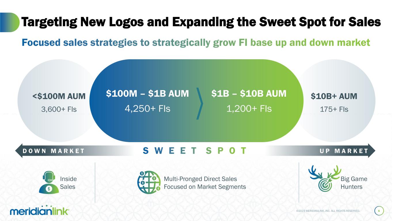 ©2023 MERIDIANLINK, INC. ALL RIGHTS RESERVED. Targeting New Logos and Expanding the Sweet Spot for Sales 6 <$100M AUM 3,600+ FIs $10B+ AUM 175+ FIs $100M – $1B AUM 4,250+ FIs $1B – $10B AUM 1,200+ FIs D O W N M A R K E T U P M A R K E T Inside Sales Big Game Hunters Multi-Pronged Direct Sales Focused on Market Segments