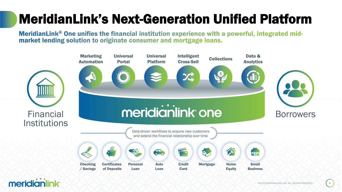©2023 MERIDIANLINK, INC. ALL RIGHTS RESERVED. 2023 and Beyond 7 Engage more deeply with customers through an effective Go-to-Market, platform strategy Expand the innovative capabilities of our platform, creating a best-of-breed solution that wins in the market Empower customer growth with frictionless software solutions and access to hundreds of partners Strengthen competitive positioning by acquiring differentiating capabilities and increasing market share Structure organization to serve more customers with greater efficiency and accelerate ACV released 1 2 3 4 5 Strategic Restructuring Enhancing Product Innovation Fueling Go-to-Market Accelerating Time-to- Revenue