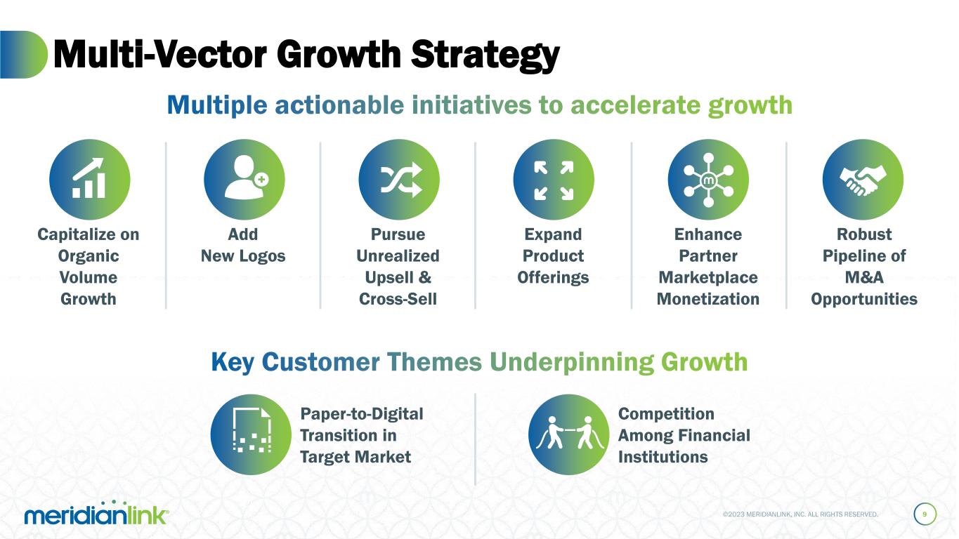 ©2023 MERIDIANLINK, INC. ALL RIGHTS RESERVED. MeridianLink’s Next-Generation Unified Platform 8 Financial Institutions Borrowers Marketing Automation Universal Portal Universal Platform Intelligent Cross-Sell Collections Data & Analytics Checking / Savings Certificates of Deposits Personal Loan Auto Loan Credit Card Mortgage Home Equity Small Business Data-driven workflows to acquire new customers and extend the financial relationship over time
