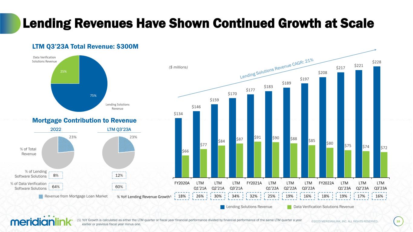 ©2023 MERIDIANLINK, INC. ALL RIGHTS RESERVED. Multi-Vector Growth Strategy 9 Paper-to-Digital Transition in Target Market Pursue Unrealized Upsell & Cross-Sell Expand Product Offerings Enhance Partner Marketplace Monetization Robust Pipeline of M&A Opportunities Add New Logos Capitalize on Organic Volume Growth Competition Among Financial Institutions