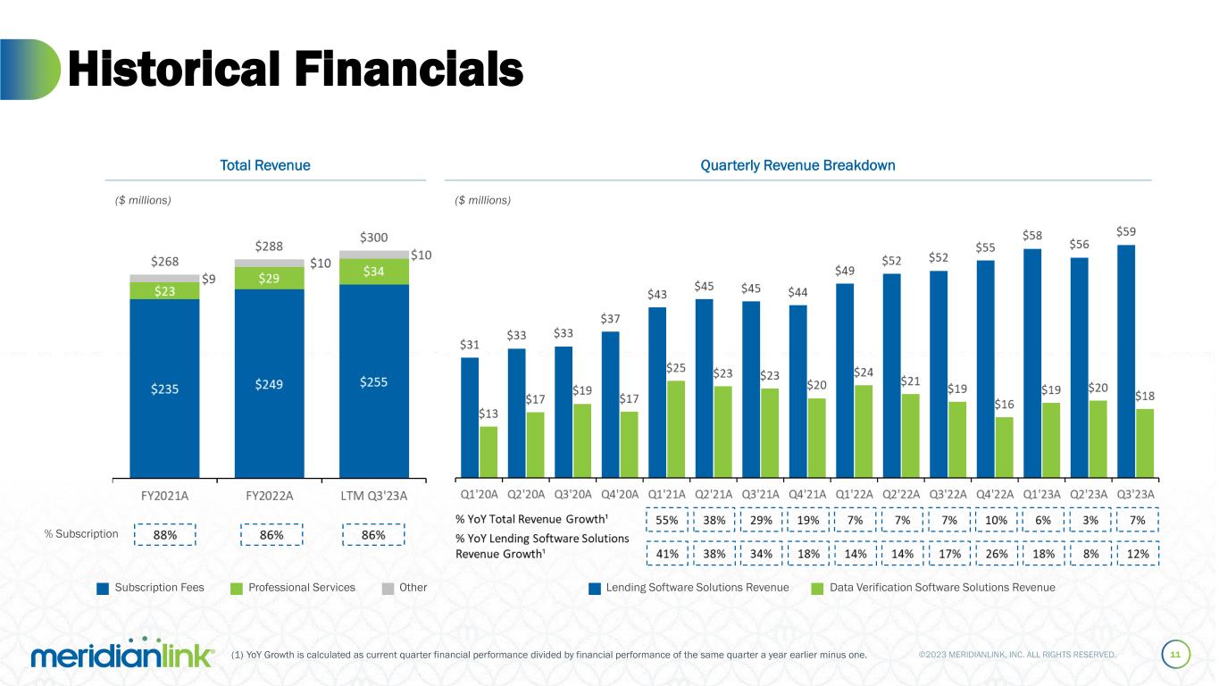©2023 MERIDIANLINK, INC. ALL RIGHTS RESERVED. Lending Revenues Have Shown Continued Growth at Scale 10 Lending Solutions Revenue Data Verification Solutions Revenue LTM Q3’23A Total Revenue: $300M % YoY Lending Revenue Growth¹Revenue from Mortgage Loan Market % of Total Revenue % of Lending Software Solutions 2022 LTM Q3’23A 8% 64% 12% 60% Mortgage Contribution to Revenue ($ millions) % of Data Verification Software Solutions (1) YoY Growth is calculated as either the LTM quarter or fiscal year financial performance divided by financial performance of the same LTM quarter a year earlier or previous fiscal year minus one.