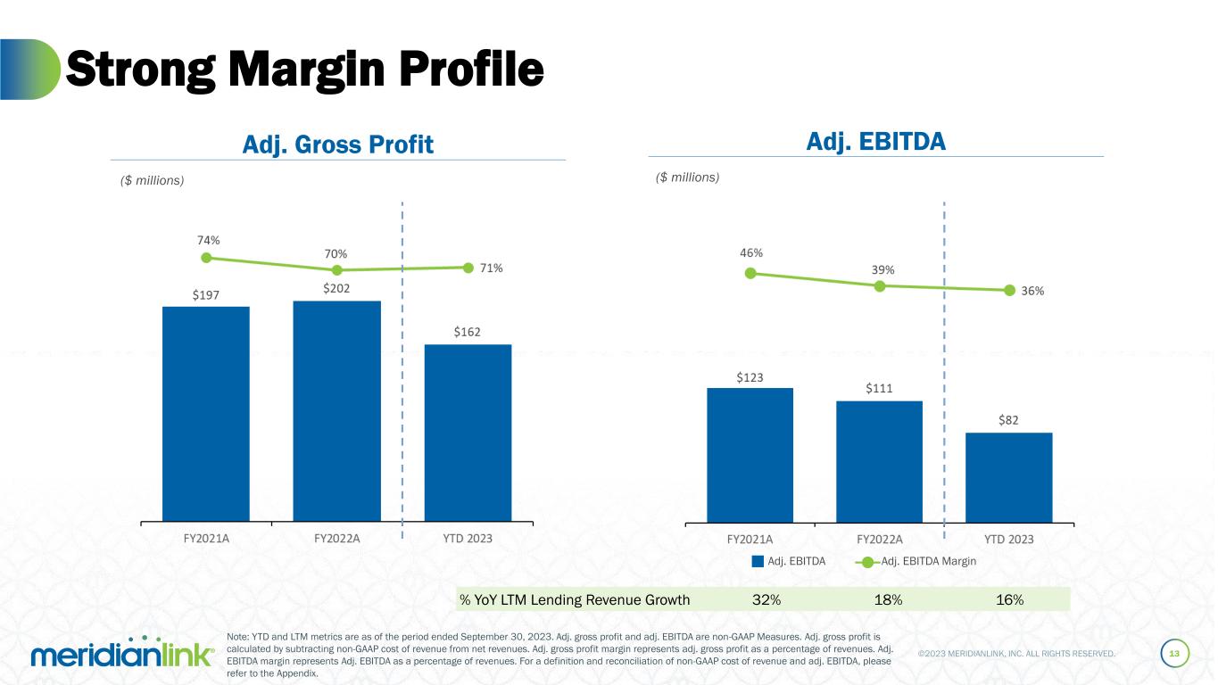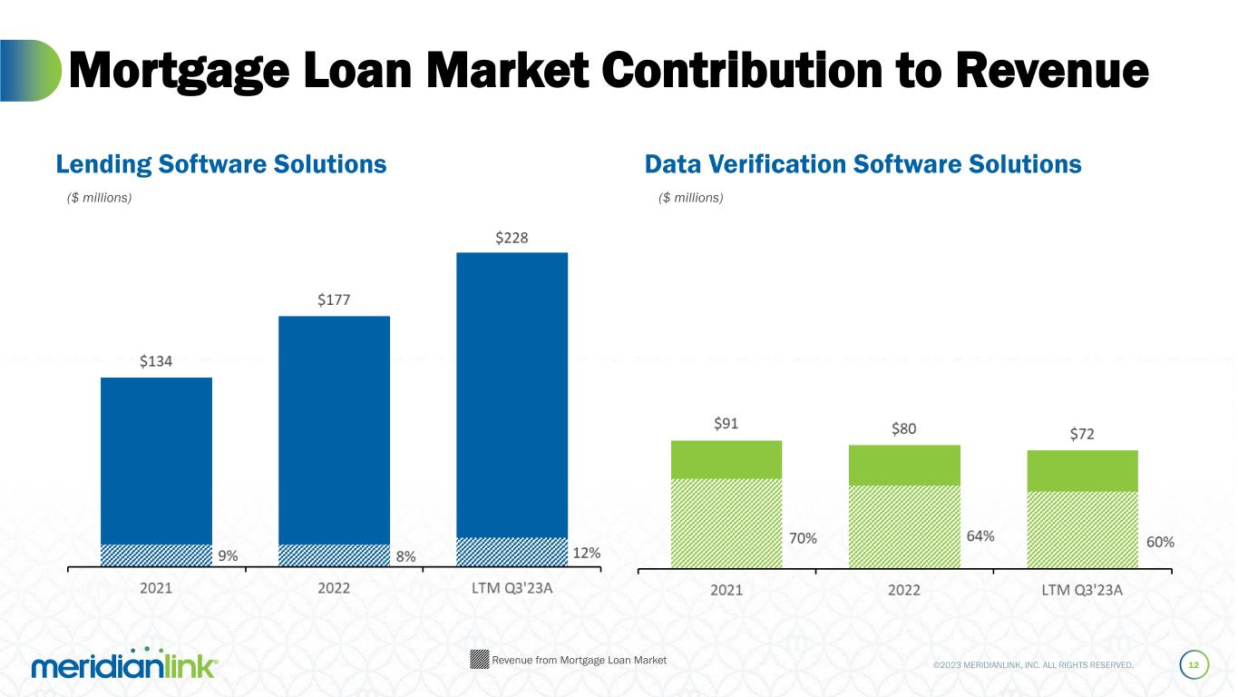 ©2023 MERIDIANLINK, INC. ALL RIGHTS RESERVED. Mortgage Loan Market Contribution to Revenue 12 Lending Software Solutions Data Verification Software Solutions Revenue from Mortgage Loan Market ($ millions) ($ millions)