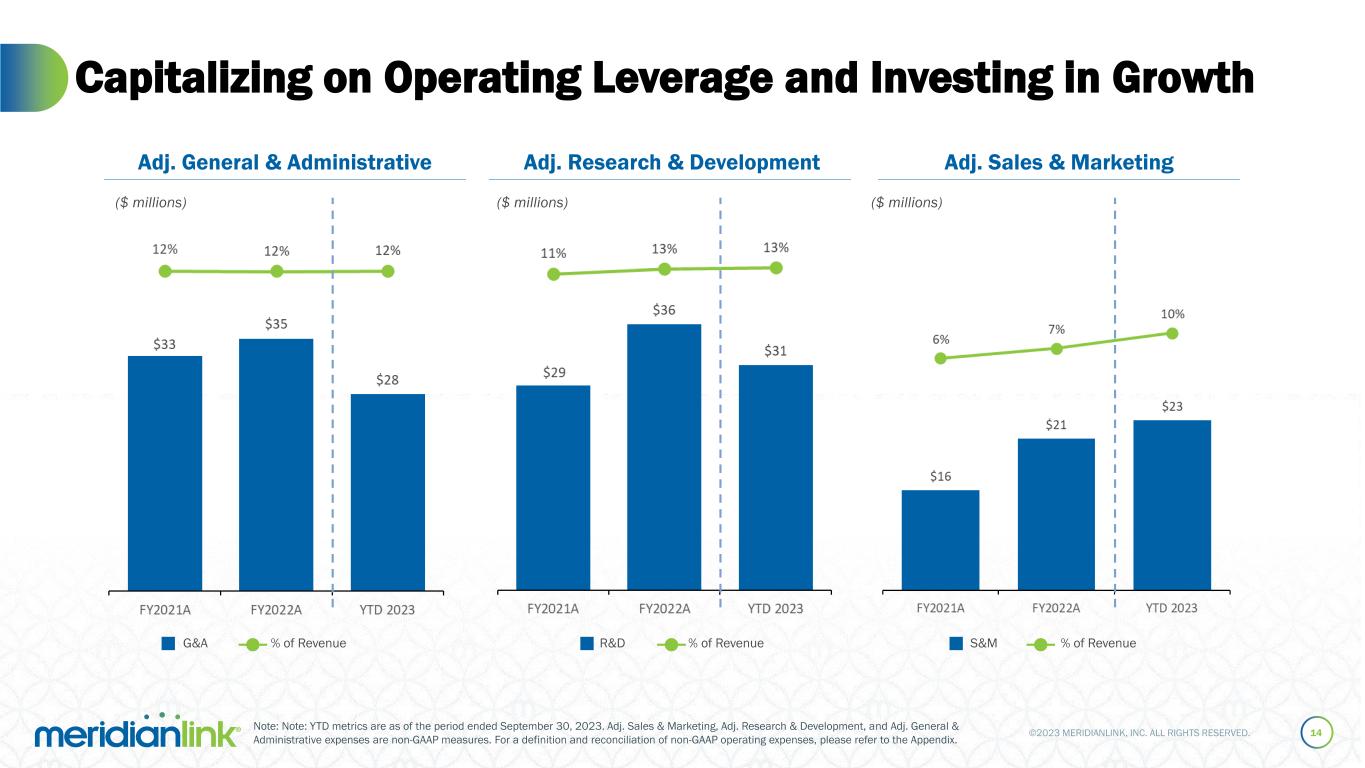 ©2023 MERIDIANLINK, INC. ALL RIGHTS RESERVED. Strong Margin Profile 13 Adj. Gross Profit ($ millions) Adj. EBITDA ($ millions) Adj. EBITDA Adj. EBITDA Margin % YoY LTM Lending Revenue Growth 32% 18% 16% Note: YTD and LTM metrics are as of the period ended September 30, 2023. Adj. gross profit and adj. EBITDA are non-GAAP Measures. Adj. gross profit is calculated by subtracting non-GAAP cost of revenue from net revenues. Adj. gross profit margin represents adj. gross profit as a percentage of revenues. Adj. EBITDA margin represents Adj. EBITDA as a percentage of revenues. For a definition and reconciliation of non-GAAP cost of revenue and adj. EBITDA, please refer to the Appendix.