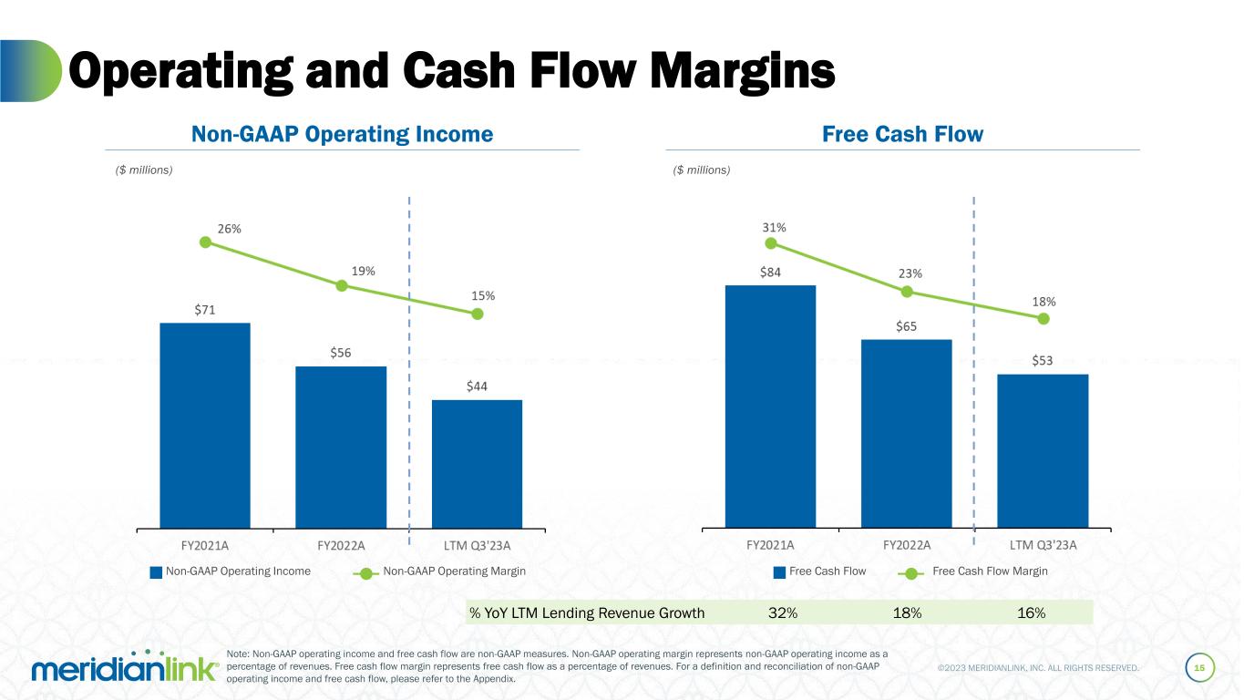 ©2023 MERIDIANLINK, INC. ALL RIGHTS RESERVED. Capitalizing on Operating Leverage and Investing in Growth 14 Adj. General & Administrative Adj. Research & Development Adj. Sales & Marketing ($ millions) ($ millions) ($ millions) S&M % of RevenueR&D % of RevenueG&A % of Revenue Note: Note: YTD metrics are as of the period ended September 30, 2023. Adj. Sales & Marketing, Adj. Research & Development, and Adj. General & Administrative expenses are non-GAAP measures. For a definition and reconciliation of non-GAAP operating expenses, please refer to the Appendix.