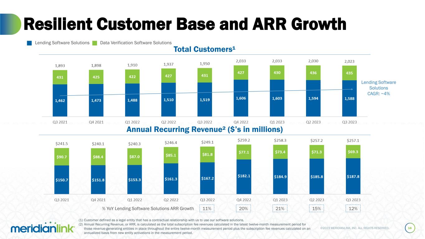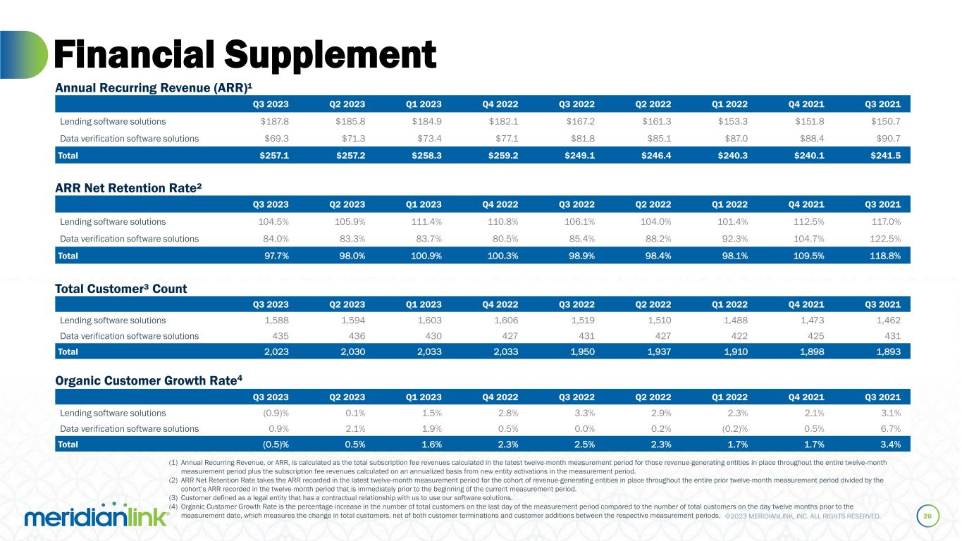©2023 MERIDIANLINK, INC. ALL RIGHTS RESERVED. Financial Supplement 27 Q3 2023 Q2 2023 Q1 2023 Q4 2022 Q3 2022 Q2 2022 Q1 2022 Q4 2021 Q3 2021 Lending software solutions $187.7 $185.9 $184.8 $181.8 $167.1 $161.1 $153.3 $151.8 $150.7 Data verification software solutions $69.3 $71.3 $73.4 $77.1 $81.8 $85.1 $87.1 $88.4 $90.7 Total $257.0 $257.2 $258.2 $258.9 $248.9 $246.2 $240.4 $240.1 $241.5 Annual Recurring Revenue (ARR)¹ Q3 2023 Q2 2023 Q1 2023 Q4 2022 Q3 2022 Q2 2022 Q1 2022 Q4 2021 Q3 2021 Lending software solutions 104.7% 106.2% 111.2% 110.6% 106.0% 103.9% 101.4% 112.5% 117.0% Data verification software solutions 84.0% 83.3% 83.7% 80.5% 85.4% 88.2% 92.3% 104.7% 122.5% Total 97.7% 98.1% 100.9% 100.2% 98.8% 98.3% 98.1% 109.5% 118.8% ARR Net Retention Rate² Organic Customer Growth Rate4 Q3 2023 Q2 2023 Q1 2023 Q4 2022 Q3 2022 Q2 2022 Q1 2022 Q4 2021 Q3 2021 Lending software solutions 1,583 1,593 1,597 1,604 1,519 1,516 1,495 1,475 1,459 Data verification software solutions 437 436 430 430 433 429 431 426 430 Total 2,020 2,029 2,027 2,034 1,952 1,945 1,926 1,901 1,889 Total Customer³ Count Q3 2023 Q2 2023 Q1 2023 Q4 2022 Q3 2022 Q2 2022 Q1 2022 Q4 2021 Q3 2021 Lending software solutions (1.3)% (0.4)% 0.7% 2.5% 3.5% 3.5% 3.1% 2.5% 3.2% Data verification software solutions 1.9% 1.6% (0.2)% 0.9% 0.7% 1.4% 2.4% 0.9% 6.7% Total (0.8)% 0.1% 0.5% 2.2% 2.9% 3.0% 2.9% 2.2% 3.5% During the three months ended September 30, 2023, we refined our methodology to incorporate process improvements around customer count, resulting in immaterial adjustments in prior periods to total customers, and, in turn, immaterially affecting other key operating measures such as annual recurring revenue, organic customer growth rate, and ARR net retention rate, as described below. Using our prior methodology, the key operating measures are provided in the tables below. We continue to improve our processes to track our key operating measures, which may subject these measures to future refinement.