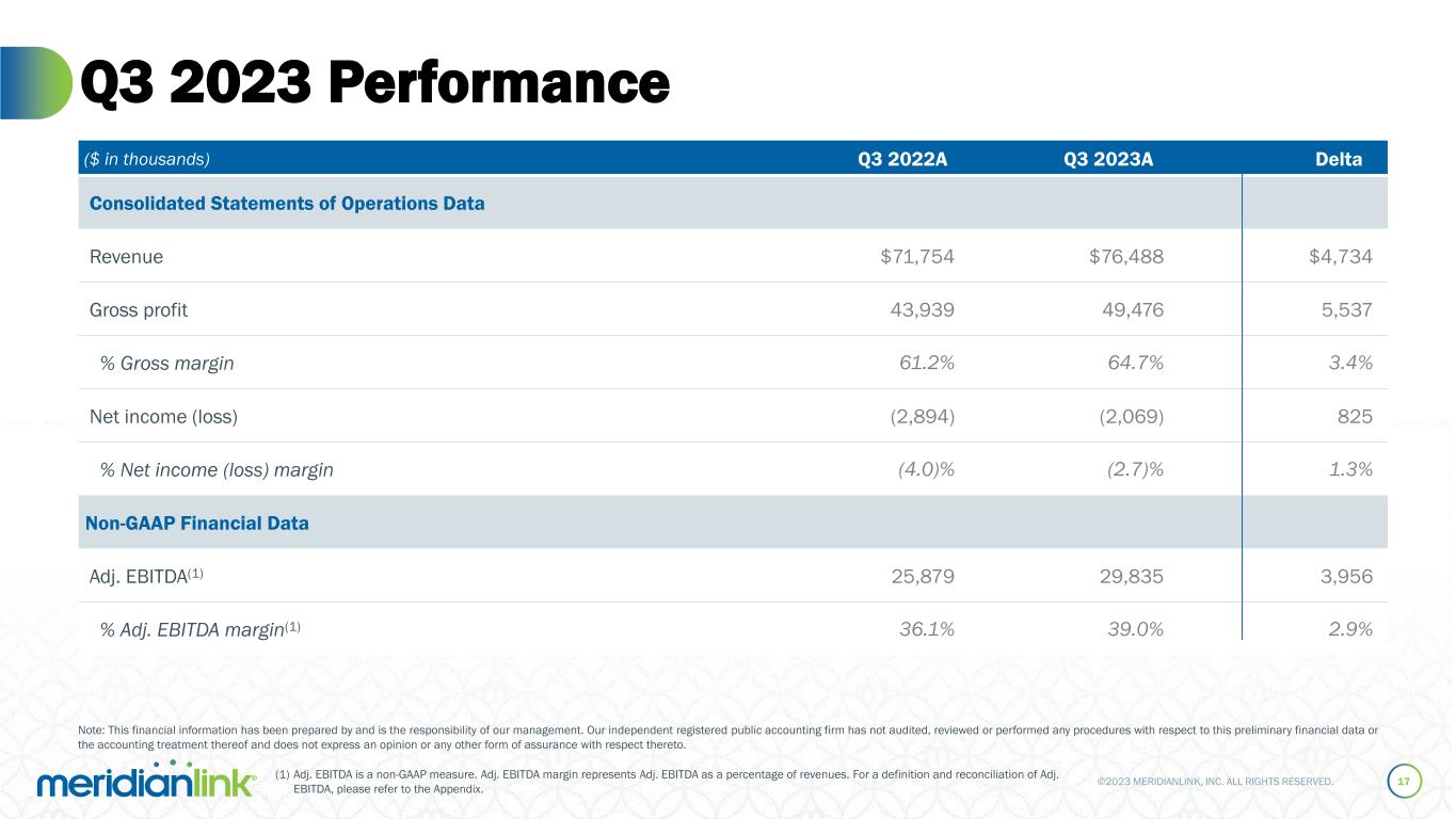 ©2023 MERIDIANLINK, INC. ALL RIGHTS RESERVED. Resilient Customer Base and ARR Growth 16 Lending Software Solutions CAGR: ~4% Total Customers¹ Annual Recurring Revenue² ($’s in millions) 11% 12%15%21%20%% YoY Lending Software Solutions ARR Growth Data Verification Software SolutionsLending Software Solutions (1) Customer defined as a legal entity that has a contractual relationship with us to use our software solutions. (2) Annual Recurring Revenue, or ARR, is calculated as the total subscription fee revenues calculated in the latest twelve-month measurement period for those revenue-generating entities in place throughout the entire twelve-month measurement period plus the subscription fee revenues calculated on an annualized basis from new entity activations in the measurement period.