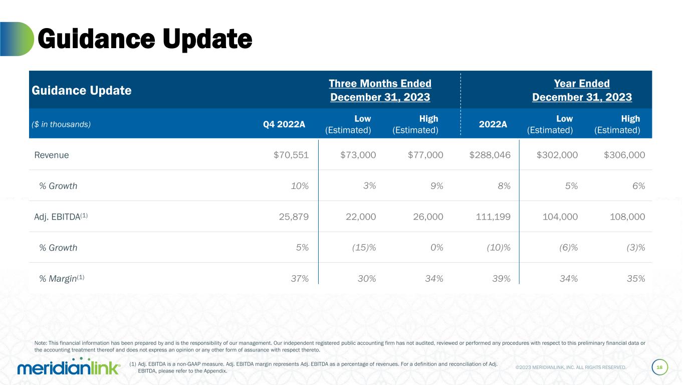 ©2023 MERIDIANLINK, INC. ALL RIGHTS RESERVED. Q3 2023 Performance 17 ($ in thousands) Q3 2022A Q3 2023A Delta Consolidated Statements of Operations Data Revenue $71,754 $76,488 $4,734 Gross profit 43,939 49,476 5,537 % Gross margin 61.2% 64.7% 3.4% Net income (loss) (2,894) (2,069) 825 % Net income (loss) margin (4.0)% (2.7)% 1.3% Non-GAAP Financial Data Adj. EBITDA(1) 25,879 29,835 3,956 % Adj. EBITDA margin(1) 36.1% 39.0% 2.9% Note: This financial information has been prepared by and is the responsibility of our management. Our independent registered public accounting firm has not audited, reviewed or performed any procedures with respect to this preliminary financial data or the accounting treatment thereof and does not express an opinion or any other form of assurance with respect thereto. (1) Adj. EBITDA is a non-GAAP measure. Adj. EBITDA margin represents Adj. EBITDA as a percentage of revenues. For a definition and reconciliation of Adj. EBITDA, please refer to the Appendix.