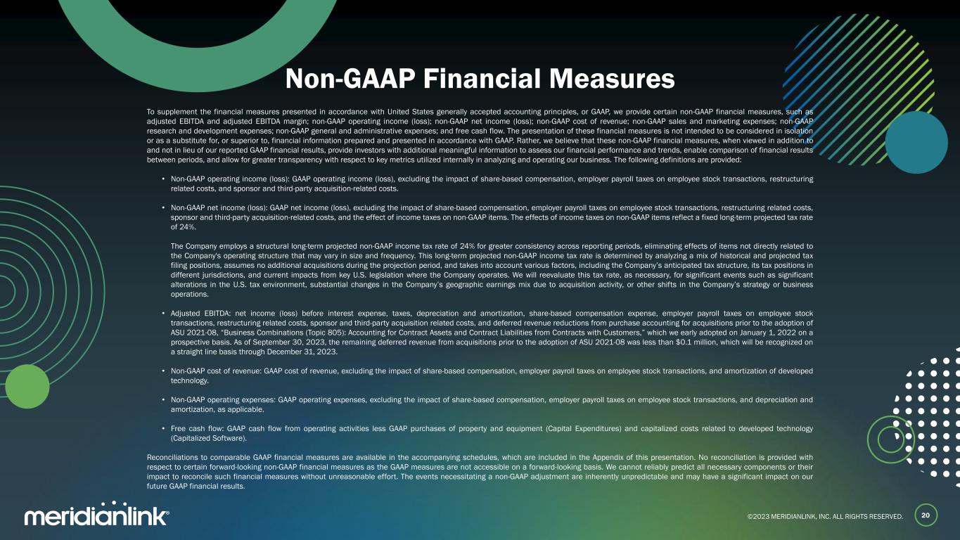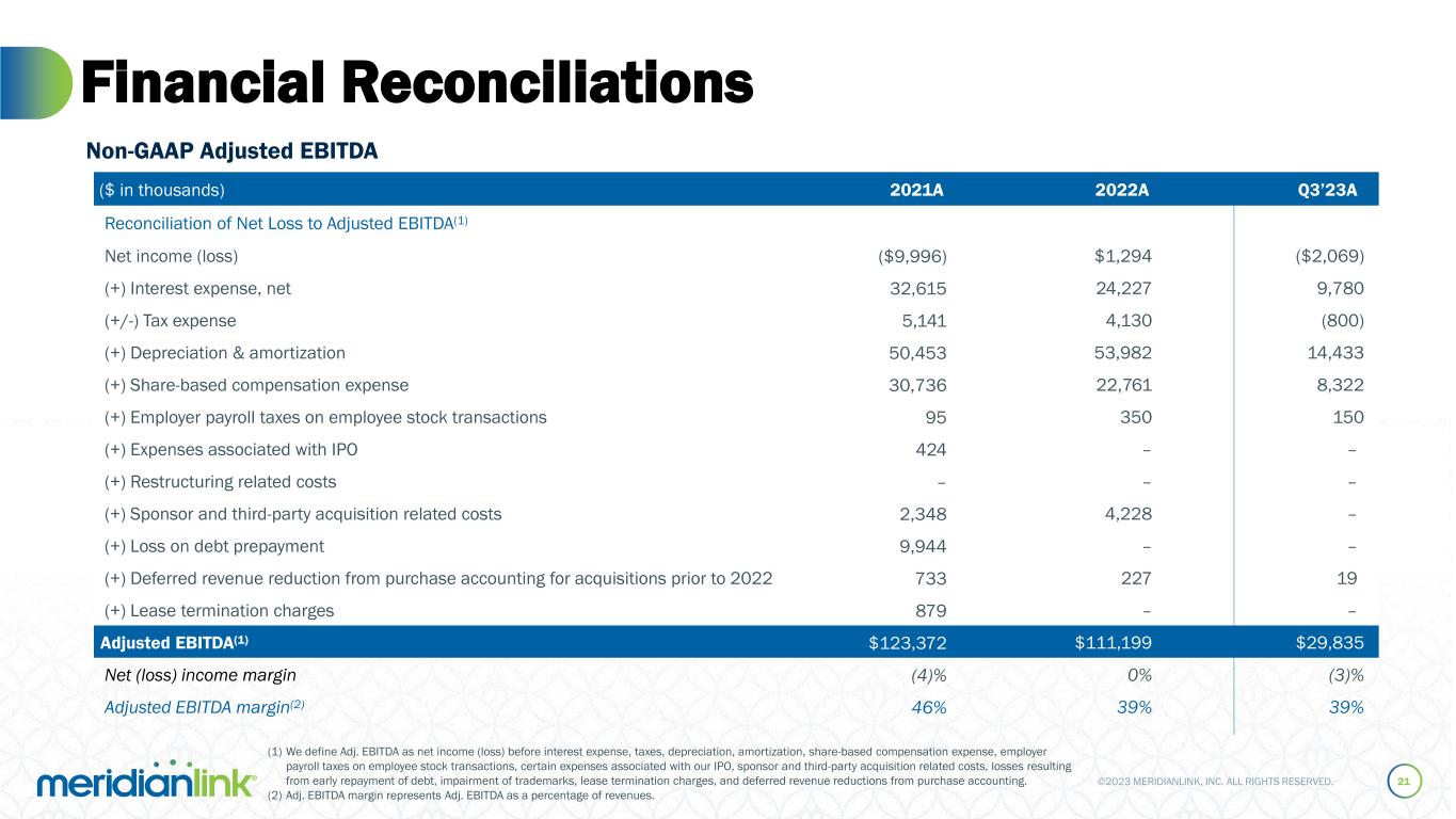 ©2023 MERIDIANLINK, INC. ALL RIGHTS RESERVED.©2023 MERIDIA LINK, INC. ALL IGHTS RESERVED. Non-GAAP Financial Measures To supplement the financial measures presented in accordance with United States generally accepted accounting principles, or GAAP, we provide certain non-GAAP financial measures, such as adjusted EBITDA and adjusted EBITDA margin; non-GAAP operating income (loss); non-GAAP net income (loss); non-GAAP cost of revenue; non-GAAP sales and marketing expenses; non-GAAP research and development expenses; non-GAAP general and administrative expenses; and free cash flow. The presentation of these financial measures is not intended to be considered in isolation or as a substitute for, or superior to, financial information prepared and presented in accordance with GAAP. Rather, we believe that these non-GAAP financial measures, when viewed in addition to and not in lieu of our reported GAAP financial results, provide investors with additional meaningful information to assess our financial performance and trends, enable comparison of financial results between periods, and allow for greater transparency with respect to key metrics utilized internally in analyzing and operating our business. The following definitions are provided: • Non-GAAP operating income (loss): GAAP operating income (loss), excluding the impact of share-based compensation, employer payroll taxes on employee stock transactions, restructuring related costs, and sponsor and third-party acquisition-related costs. • Non-GAAP net income (loss): GAAP net income (loss), excluding the impact of share-based compensation, employer payroll taxes on employee stock transactions, restructuring related costs, sponsor and third-party acquisition-related costs, and the effect of income taxes on non-GAAP items. The effects of income taxes on non-GAAP items reflect a fixed long-term projected tax rate of 24%. The Company employs a structural long-term projected non-GAAP income tax rate of 24% for greater consistency across reporting periods, eliminating effects of items not directly related to the Company's operating structure that may vary in size and frequency. This long-term projected non-GAAP income tax rate is determined by analyzing a mix of historical and projected tax filing positions, assumes no additional acquisitions during the projection period, and takes into account various factors, including the Company’s anticipated tax structure, its tax positions in different jurisdictions, and current impacts from key U.S. legislation where the Company operates. We will reevaluate this tax rate, as necessary, for significant events such as significant alterations in the U.S. tax environment, substantial changes in the Company’s geographic earnings mix due to acquisition activity, or other shifts in the Company’s strategy or business operations. • Adjusted EBITDA: net income (loss) before interest expense, taxes, depreciation and amortization, share-based compensation expense, employer payroll taxes on employee stock transactions, restructuring related costs, sponsor and third-party acquisition related costs, and deferred revenue reductions from purchase accounting for acquisitions prior to the adoption of ASU 2021-08, “Business Combinations (Topic 805): Accounting for Contract Assets and Contract Liabilities from Contracts with Customers,” which we early adopted on January 1, 2022 on a prospective basis. As of September 30, 2023, the remaining deferred revenue from acquisitions prior to the adoption of ASU 2021-08 was less than $0.1 million, which will be recognized on a straight line basis through December 31, 2023. • Non-GAAP cost of revenue: GAAP cost of revenue, excluding the impact of share-based compensation, employer payroll taxes on employee stock transactions, and amortization of developed technology. • Non-GAAP operating expenses: GAAP operating expenses, excluding the impact of share-based compensation, employer payroll taxes on employee stock transactions, and depreciation and amortization, as applicable. • Free cash flow: GAAP cash flow from operating activities less GAAP purchases of property and equipment (Capital Expenditures) and capitalized costs related to developed technology (Capitalized Software). Reconciliations to comparable GAAP financial measures are available in the accompanying schedules, which are included in the Appendix of this presentation. No reconciliation is provided with respect to certain forward-looking non-GAAP financial measures as the GAAP measures are not accessible on a forward-looking basis. We cannot reliably predict all necessary components or their impact to reconcile such financial measures without unreasonable effort. The events necessitating a non-GAAP adjustment are inherently unpredictable and may have a significant impact on our future GAAP financial results. 20