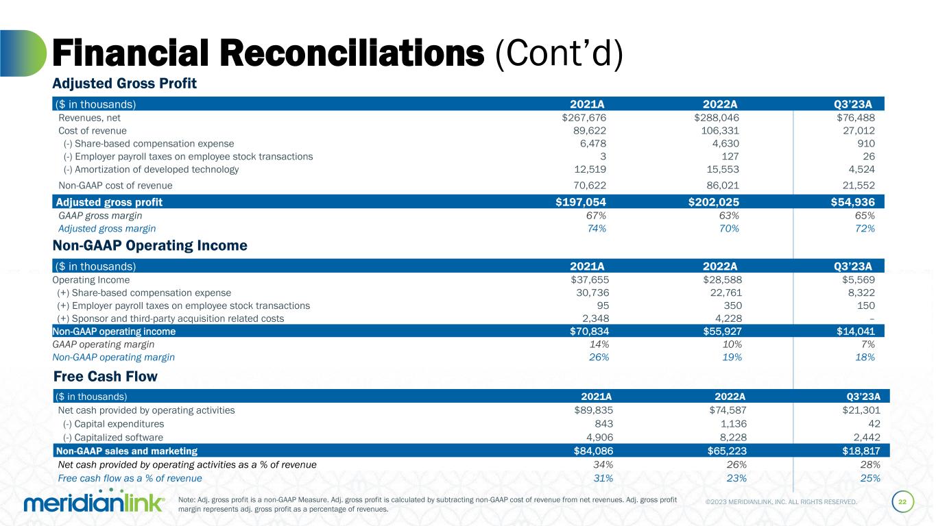 ©2023 MERIDIANLINK, INC. ALL RIGHTS RESERVED. Financial Reconciliations 21 ($ in thousands) 2021A 2022A Q3’23A Reconciliation of Net Loss to Adjusted EBITDA(1) Net income (loss) ($9,996) $1,294 ($2,069) (+) Interest expense, net 32,615 24,227 9,780 (+/-) Tax expense 5,141 4,130 (800) (+) Depreciation & amortization 50,453 53,982 14,433 (+) Share-based compensation expense 30,736 22,761 8,322 (+) Employer payroll taxes on employee stock transactions 95 350 150 (+) Expenses associated with IPO 424 – – (+) Restructuring related costs – – – (+) Sponsor and third-party acquisition related costs 2,348 4,228 – (+) Loss on debt prepayment 9,944 – – (+) Deferred revenue reduction from purchase accounting for acquisitions prior to 2022 733 227 19 (+) Lease termination charges 879 – – Adjusted EBITDA(1) $123,372 $111,199 $29,835 Net (loss) income margin (4)% 0% (3)% Adjusted EBITDA margin(2) 46% 39% 39% Non-GAAP Adjusted EBITDA (1) We define Adj. EBITDA as net income (loss) before interest expense, taxes, depreciation, amortization, share-based compensation expense, employer payroll taxes on employee stock transactions, certain expenses associated with our IPO, sponsor and third-party acquisition related costs, losses resulting from early repayment of debt, impairment of trademarks, lease termination charges, and deferred revenue reductions from purchase accounting. (2) Adj. EBITDA margin represents Adj. EBITDA as a percentage of revenues.