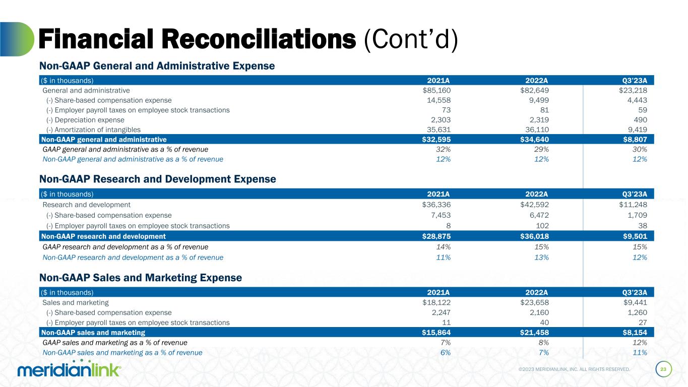 ©2023 MERIDIANLINK, INC. ALL RIGHTS RESERVED. Financial Reconciliations (Cont’d) 22 ($ in thousands) 2021A 2022A Q3’23A Revenues, net $267,676 $288,046 $76,488 Cost of revenue 89,622 106,331 27,012 (-) Share-based compensation expense 6,478 4,630 910 (-) Employer payroll taxes on employee stock transactions 3 127 26 (-) Amortization of developed technology 12,519 15,553 4,524 Non-GAAP cost of revenue 70,622 86,021 21,552 Adjusted gross profit $197,054 $202,025 $54,936 GAAP gross margin 67% 63% 65% Adjusted gross margin 74% 70% 72% Adjusted Gross Profit ($ in thousands) 2021A 2022A Q3’23A Operating Income $37,655 $28,588 $5,569 (+) Share-based compensation expense 30,736 22,761 8,322 (+) Employer payroll taxes on employee stock transactions 95 350 150 (+) Sponsor and third-party acquisition related costs 2,348 4,228 – Non-GAAP operating income $70,834 $55,927 $14,041 GAAP operating margin 14% 10% 7% Non-GAAP operating margin 26% 19% 18% Non-GAAP Operating Income Note: Adj. gross profit is a non-GAAP Measure. Adj. gross profit is calculated by subtracting non-GAAP cost of revenue from net revenues. Adj. gross profit margin represents adj. gross profit as a percentage of revenues. ($ in thousands) 2021A 2022A Q3’23A Net cash provided by operating activities $89,835 $74,587 $21,301 (-) Capital expenditures 843 1,136 42 (-) Capitalized software 4,906 8,228 2,442 Non-GAAP sales and marketing $84,086 $65,223 $18,817 Net cash provided by operating activities as a % of revenue 34% 26% 28% Free cash flow as a % of revenue 31% 23% 25% Free Cash Flow
