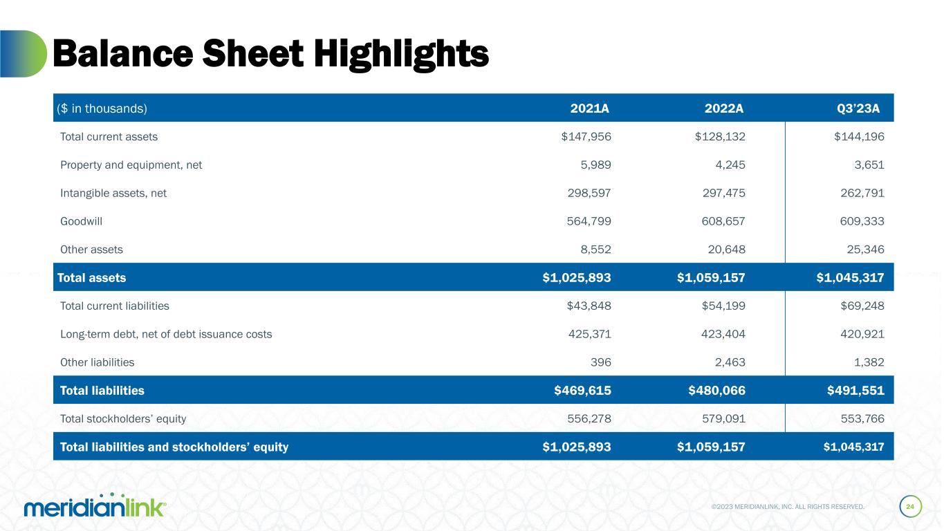 ©2023 MERIDIANLINK, INC. ALL RIGHTS RESERVED. Financial Reconciliations (Cont’d) 23 ($ in thousands) 2021A 2022A Q3’23A Sales and marketing $18,122 $23,658 $9,441 (-) Share-based compensation expense 2,247 2,160 1,260 (-) Employer payroll taxes on employee stock transactions 11 40 27 Non-GAAP sales and marketing $15,864 $21,458 $8,154 GAAP sales and marketing as a % of revenue 7% 8% 12% Non-GAAP sales and marketing as a % of revenue 6% 7% 11% Non-GAAP Sales and Marketing Expense ($ in thousands) 2021A 2022A Q3’23A Research and development $36,336 $42,592 $11,248 (-) Share-based compensation expense 7,453 6,472 1,709 (-) Employer payroll taxes on employee stock transactions 8 102 38 Non-GAAP research and development $28,875 $36,018 $9,501 GAAP research and development as a % of revenue 14% 15% 15% Non-GAAP research and development as a % of revenue 11% 13% 12% Non-GAAP Research and Development Expense ($ in thousands) 2021A 2022A Q3’23A General and administrative $85,160 $82,649 $23,218 (-) Share-based compensation expense 14,558 9,499 4,443 (-) Employer payroll taxes on employee stock transactions 73 81 59 (-) Depreciation expense 2,303 2,319 490 (-) Amortization of intangibles 35,631 36,110 9,419 Non-GAAP general and administrative $32,595 $34,640 $8,807 GAAP general and administrative as a % of revenue 32% 29% 30% Non-GAAP general and administrative as a % of revenue 12% 12% 12% Non-GAAP General and Administrative Expense