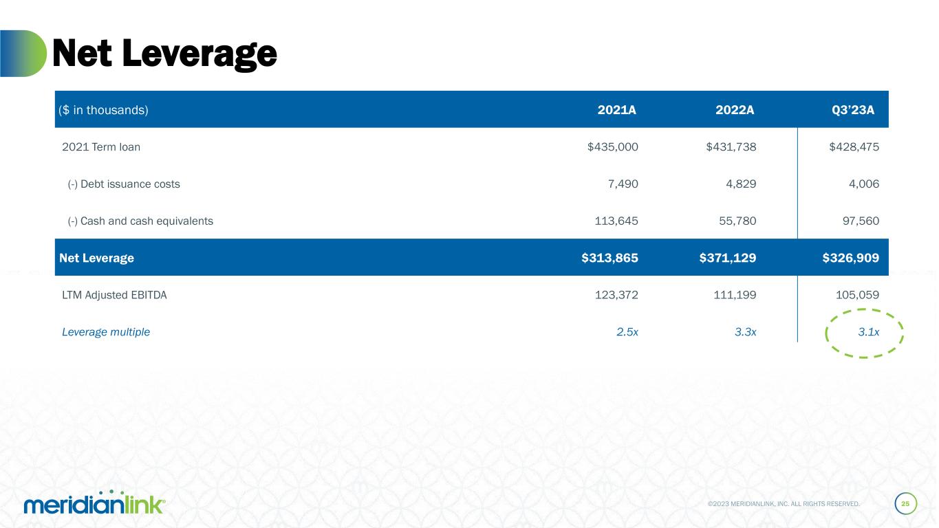 ©2023 MERIDIANLINK, INC. ALL RIGHTS RESERVED. Balance Sheet Highlights 24 ($ in thousands) 2021A 2022A Q3’23A Total current assets $147,956 $128,132 $144,196 Property and equipment, net 5,989 4,245 3,651 Intangible assets, net 298,597 297,475 262,791 Goodwill 564,799 608,657 609,333 Other assets 8,552 20,648 25,346 Total assets $1,025,893 $1,059,157 $1,045,317 Total current liabilities $43,848 $54,199 $69,248 Long-term debt, net of debt issuance costs 425,371 423,404 420,921 Other liabilities 396 2,463 1,382 Total liabilities $469,615 $480,066 $491,551 Total stockholders’ equity 556,278 579,091 553,766 Total liabilities and stockholders’ equity $1,025,893 $1,059,157 $1,045,317