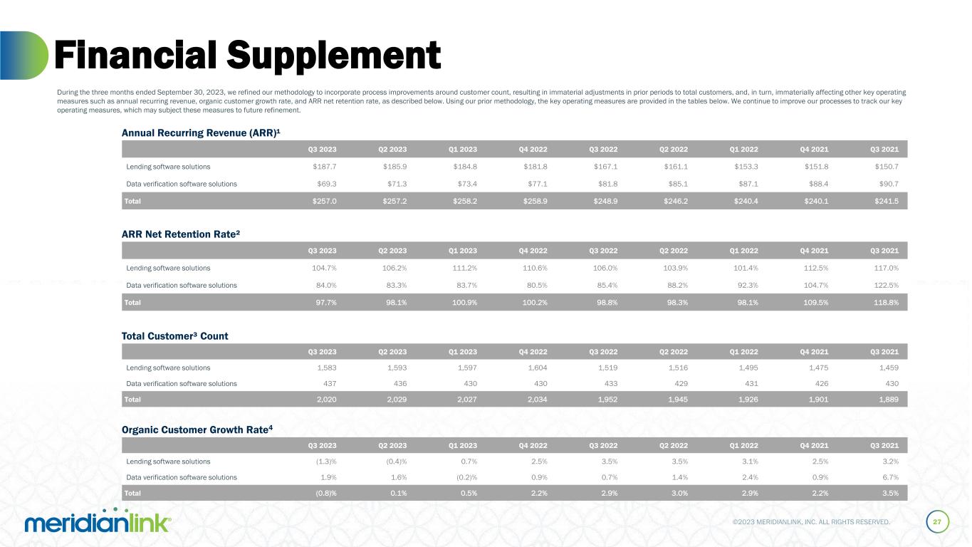 ©2023 MERIDIANLINK, INC. ALL RIGHTS RESERVED. Financial Supplement 26 Q3 2023 Q2 2023 Q1 2023 Q4 2022 Q3 2022 Q2 2022 Q1 2022 Q4 2021 Q3 2021 Lending software solutions $187.8 $185.8 $184.9 $182.1 $167.2 $161.3 $153.3 $151.8 $150.7 Data verification software solutions $69.3 $71.3 $73.4 $77.1 $81.8 $85.1 $87.0 $88.4 $90.7 Total $257.1 $257.2 $258.3 $259.2 $249.1 $246.4 $240.3 $240.1 $241.5 Annual Recurring Revenue (ARR)¹ Q3 2023 Q2 2023 Q1 2023 Q4 2022 Q3 2022 Q2 2022 Q1 2022 Q4 2021 Q3 2021 Lending software solutions 104.5% 105.9% 111.4% 110.8% 106.1% 104.0% 101.4% 112.5% 117.0% Data verification software solutions 84.0% 83.3% 83.7% 80.5% 85.4% 88.2% 92.3% 104.7% 122.5% Total 97.7% 98.0% 100.9% 100.3% 98.9% 98.4% 98.1% 109.5% 118.8% ARR Net Retention Rate² Organic Customer Growth Rate4 Q3 2023 Q2 2023 Q1 2023 Q4 2022 Q3 2022 Q2 2022 Q1 2022 Q4 2021 Q3 2021 Lending software solutions 1,588 1,594 1,603 1,606 1,519 1,510 1,488 1,473 1,462 Data verification software solutions 435 436 430 427 431 427 422 425 431 Total 2,023 2,030 2,033 2,033 1,950 1,937 1,910 1,898 1,893 Total Customer³ Count Q3 2023 Q2 2023 Q1 2023 Q4 2022 Q3 2022 Q2 2022 Q1 2022 Q4 2021 Q3 2021 Lending software solutions (0.9)% 0.1% 1.5% 2.8% 3.3% 2.9% 2.3% 2.1% 3.1% Data verification software solutions 0.9% 2.1% 1.9% 0.5% 0.0% 0.2% (0.2)% 0.5% 6.7% Total (0.5)% 0.5% 1.6% 2.3% 2.5% 2.3% 1.7% 1.7% 3.4% (1) Annual Recurring Revenue, or ARR, is calculated as the total subscription fee revenues calculated in the latest twelve-month measurement period for those revenue-generating entities in place throughout the entire twelve-month measurement period plus the subscription fee revenues calculated on an annualized basis from new entity activations in the measurement period. (2) ARR Net Retention Rate takes the ARR recorded in the latest twelve-month measurement period for the cohort of revenue-generating entities in place throughout the entire prior twelve-month measurement period divided by the cohort’s ARR recorded in the twelve-month period that is immediately prior to the beginning of the current measurement period. (3) Customer defined as a legal entity that has a contractual relationship with us to use our software solutions. (4) Organic Customer Growth Rate is the percentage increase in the number of total customers on the last day of the measurement period compared to the number of total customers on the day twelve months prior to the measurement date, which measures the change in total customers, net of both customer terminations and customer additions between the respective measurement periods.