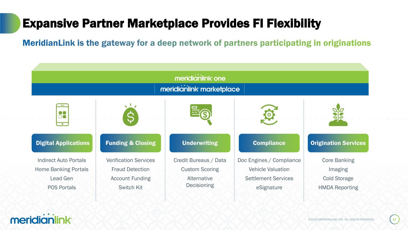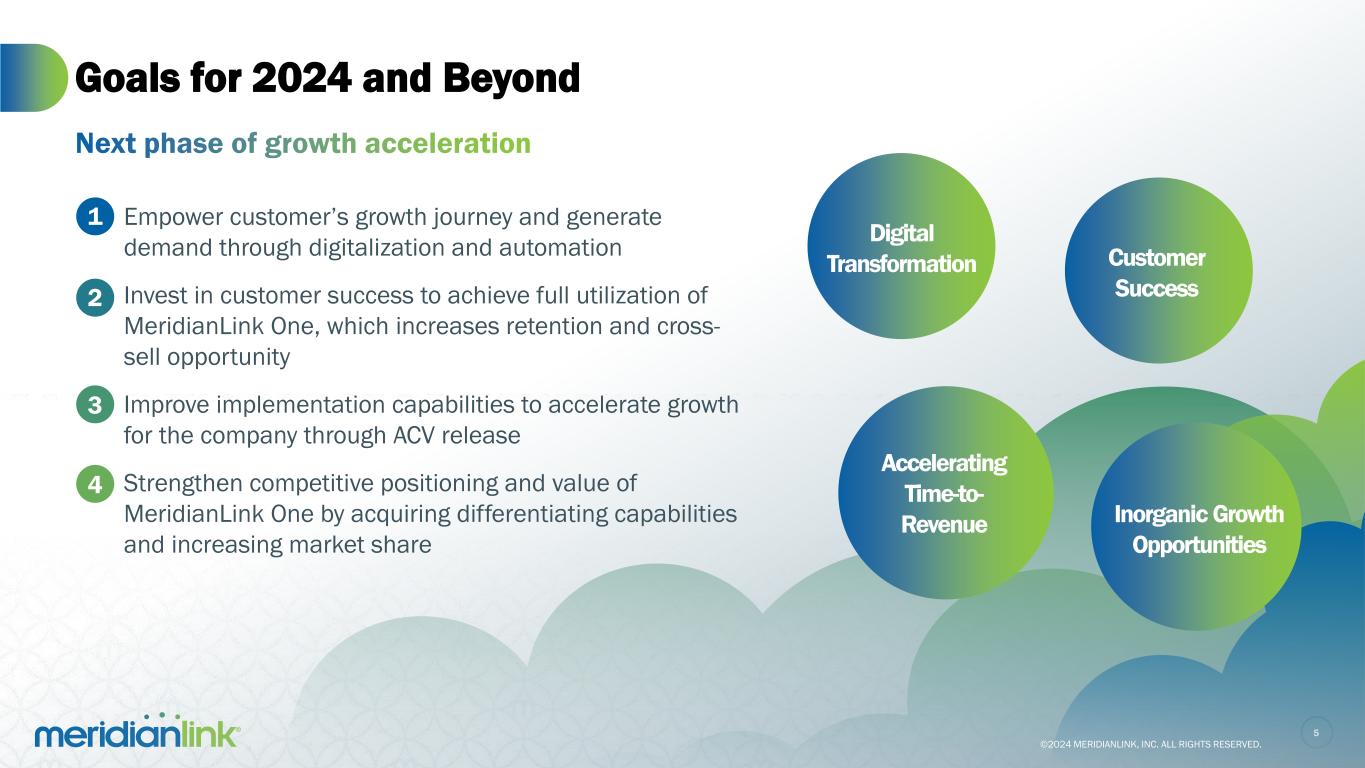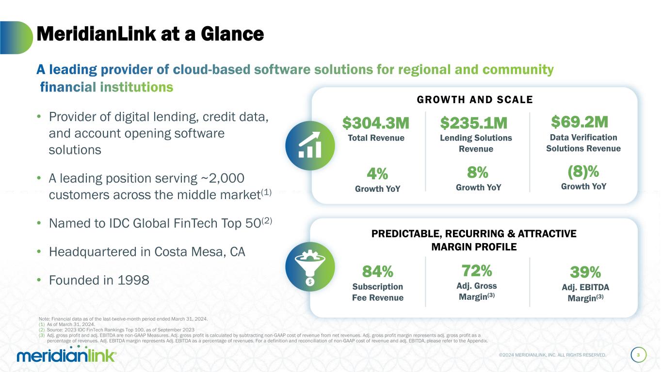 ©2024 MERIDIANLINK, INC. ALL RIGHTS RESERVED. Forward-Looking Statements and Disclaimers 2 Information in this presentation and the accompanying oral presentation contain forward-looking statements within the meaning of Section 27A of the Securities Act of 1933, as amended, and Section 21E of the Securities Exchange Act of 1934, as amended, which statements involve substantial risks and uncertainties. Forward-looking statements generally relate to future events or our future financial or operating performance. All statements other than statements of historical fact included in this presentation and the accompanying oral presentation, including statements regarding, and guidance with respect to, our strategy, future operations, financial position, projected costs, our future financial and operational performance, prospects, market size and growth opportunities, future economic conditions, competitive position, strategic initiatives, development or delivery of new or enhanced solutions, technological capabilities, plans, and objectives of management are forward-looking statements. In some cases, you can identify forward-looking statements because they contain words such as “may,” “should,” “expects,” “plans,” “anticipates,” “could,” “intends,” “target,” “projects,” “contemplates,” “believes,” “estimates,” “predicts,” “potential,” or “continue” or the negative of these words or other similar terms or expressions that concern our expectations, strategy, plans, or intentions. These forward-looking statements reflect our predictions, expectations, or forecasts. Actual results may differ materially from those described in the forward-looking statements and will be affected by a variety of risks and factors that are beyond our control including, without limitation, risks related to economic and market conditions, including interest rate fluctuations; our ability to retain and attract customers; our ability to expand and evolve our offerings, features, and functionalities or respond to rapid technological changes; our ability to identify and integrate strategic initiatives; our leadership transition and plans; our realignment plan, including expected associated timing, benefits, and costs; our stock repurchase programs, including the execution and amount of repurchases; our ability to maintain effective internal control over financial reporting and disclosure controls and procedures; our ability to compete in a highly-fragmented and competitive landscape; market demand for our products and solutions; our ability to effectively implement, integrate, and service our customers; our ability to retain and attract product partners; the benefit to us and our customers of integrations with our product partners; our commercial disputes, including potential losses related thereto; our future financial performance, including, but not limited to, trends in revenue, costs of revenue, gross profit or gross margin, operating expenses, and number of customers; and our high levels of indebtedness; as well as those set forth in Item 1A. Risk Factors, or elsewhere, in our Annual Report on Form 10-K for the most recently ended fiscal year, any updates in our Quarterly Reports on Form 10-Q filed for periods subsequent to such Form 10-K, and our other SEC filings. These forward-looking statements are based on reasonable assumptions as of the date hereof. The plans, intentions, or expectations disclosed in our forward-looking statements may not be achieved, and you should not rely upon forward- looking statements as predictions of future events. We undertake no obligation, other than as required by applicable law, to update any forward-looking statements, whether as a result of new information, future events, or otherwise. Information in this presentation and the accompanying oral presentation, including any statements regarding MeridianLink’s customer data and other metrics, is based on data and analyses from various sources as of December 31, 2023, unless otherwise indicated. This presentation contains statistical data, estimates, and forecasts that are based on independent industry publications or other publicly available information, as well as other information based on our internal sources. This information involves many assumptions and limitations, and you are cautioned not to give undue weight to these estimates. We have not independently verified the accuracy or completeness of the data contained in these industry publications and other publicly available information. Accordingly, we make no representations as to the accuracy or completeness of that data nor do we undertake to update such data after the date of this presentation. Copyright Notice: All copyrightable text and graphics, the selection, arrangement, and presentation of all materials (including information in the public domain) are ©2024 MeridianLink, Inc. All rights reserved. This presentation includes trademarks, which are protected under applicable intellectual property laws and are the property of MeridianLink, Inc. or its subsidiaries. This presentation may also contain trademarks, service marks, copyrights, and trade names of other companies, which are the property of their respective owners and are used for reference purposes only. Such use should not be construed as an endorsement of the platform and products of MeridianLink. Solely for convenience, trademarks and trade names may appear without the ® or symbols, but such references are not intended to indicate that, with respect to our intellectual property, we will not assert, to the fullest extent under applicable law, our rights or the right of the applicable licensor to these trademarks and trade names.