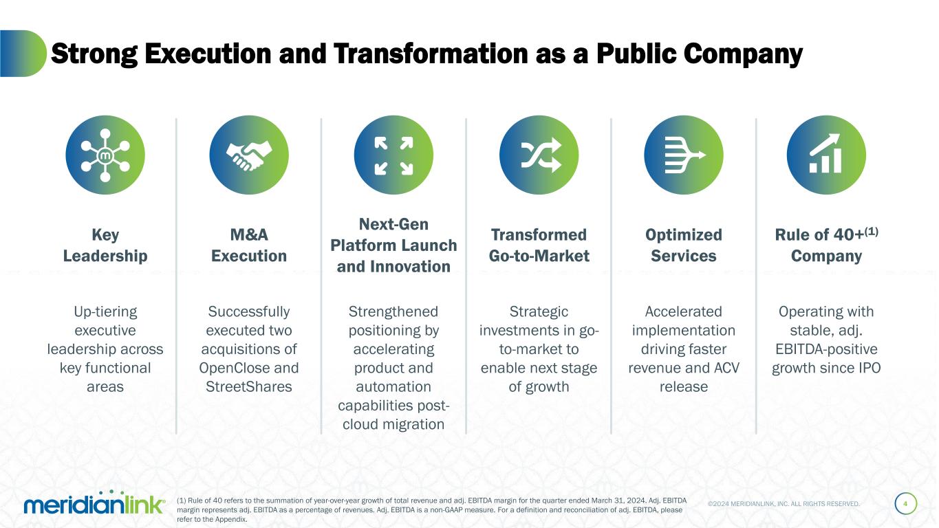 ©2024 MERIDIANLINK, INC. ALL RIGHTS RESERVED. MeridianLink at a Glance 3 A leading provider of cloud-based software solutions for regional and community financial institutions GROWTH AND SCALE $69.2M 4% Growth YoY $235.1M$304.3M (8)% Growth YoY 8% Growth YoY PREDICTABLE, RECURRING & ATTRACTIVE MARGIN PROFILE 84% Subscription Fee Revenue 72% Adj. Gross Margin(3) 39% Adj. EBITDA Margin(3) Total Revenue Lending Solutions Revenue Data Verification Solutions Revenue Note: Financial data as of the last-twelve-month period ended March 31, 2024. (1) As of March 31, 2024. (2) Source: 2023 IDC FinTech Rankings Top 100, as of September 2023 (3) Adj. gross profit and adj. EBITDA are non-GAAP Measures. Adj. gross profit is calculated by subtracting non-GAAP cost of revenue from net revenues. Adj. gross profit margin represents adj. gross profit as a percentage of revenues. Adj. EBITDA margin represents Adj. EBITDA as a percentage of revenues. For a definition and reconciliation of non-GAAP cost of revenue and adj. EBITDA, please refer to the Appendix. • Provider of digital lending, credit data, and account opening software solutions • A leading position serving ~2,000 customers across the middle market(1) • Named to IDC Global FinTech Top 50(2) • Headquartered in Costa Mesa, CA • Founded in 1998