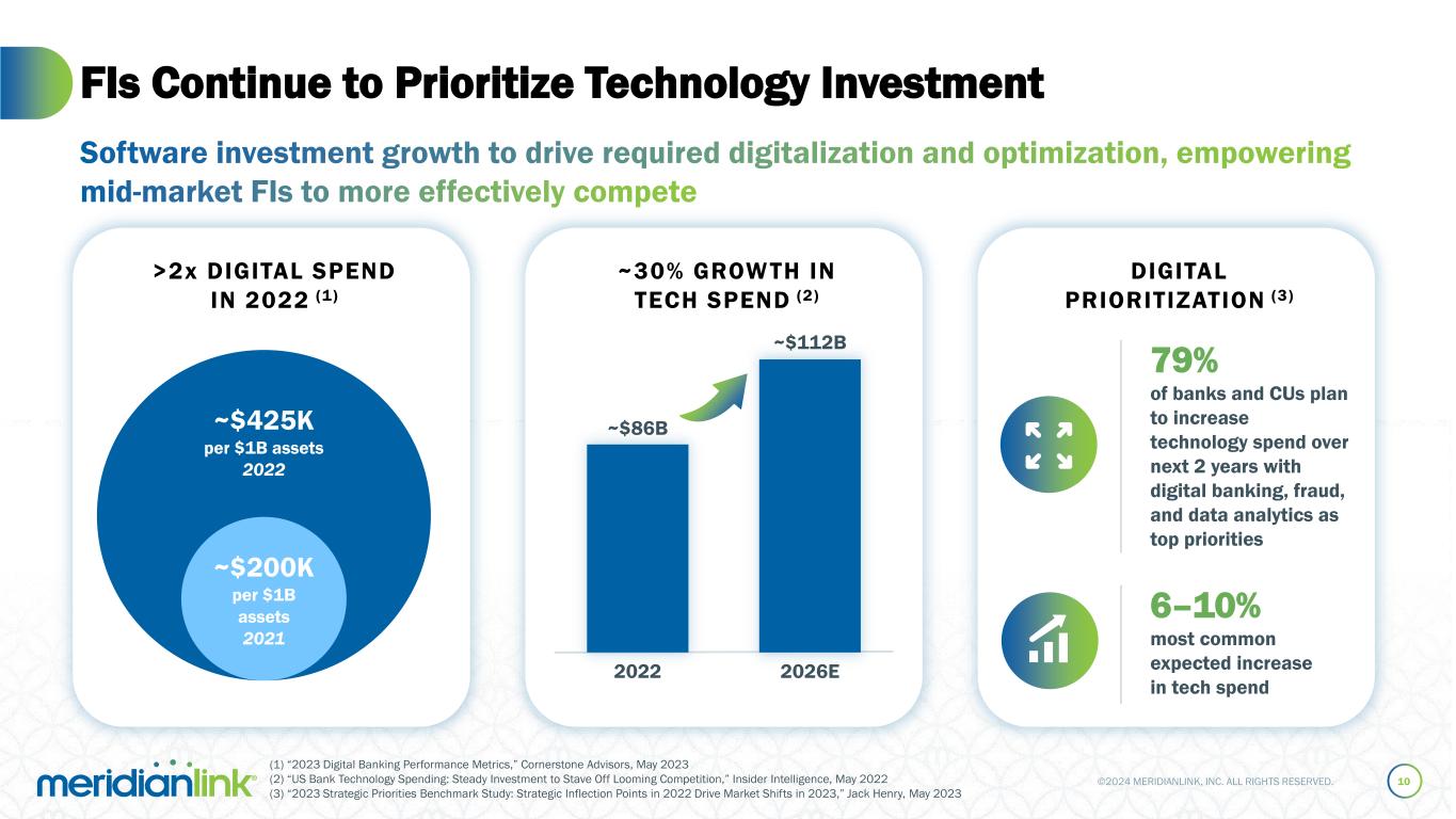 ©2024 MERIDIANLINK, INC. ALL RIGHTS RESERVED. Digital Transformation Has Significantly Accelerated 9 Consumer lending is at the forefront of a 10+ year digitalization opportunity I N N O V AT O R S E A R LY A D O P T E R S E A R LY M A J O R I T Y L AT E M A J O R I T Y L A G G A R D S DIG ITA L ADOPTION CURVE 100% 0% Consumer Lending Mortgage Lending Continued digital growth expected as laggards follow the market trends COVID-19 fast-tracked the consumer adoption to digital Growth in Digital Transactions Accelerated Growth vs. pre-COVID Substantial Expected Future YoY Increases