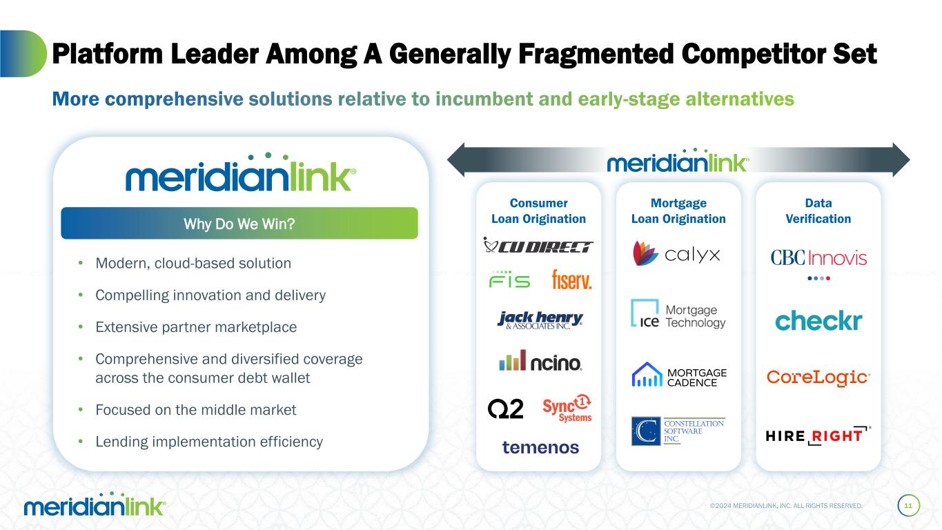 ©2024 MERIDIANLINK, INC. ALL RIGHTS RESERVED. FIs Continue to Prioritize Technology Investment 10 Software investment growth to drive required digitalization and optimization, empowering mid-market FIs to more effectively compete >2x DIGITAL SPEND IN 2022 (1) ~30% GROWTH IN TECH SPEND (2) DIGITAL PRIORITIZATION (3) 79% of banks and CUs plan to increase technology spend over next 2 years with digital banking, fraud, and data analytics as top priorities (1) “2023 Digital Banking Performance Metrics,” Cornerstone Advisors, May 2023 (2) “US Bank Technology Spending: Steady Investment to Stave Off Looming Competition,” Insider Intelligence, May 2022 (3) “2023 Strategic Priorities Benchmark Study: Strategic Inflection Points in 2022 Drive Market Shifts in 2023,” Jack Henry, May 2023 6–10% most common expected increase in tech spend 2022 2026E ~$86B ~$112B ~$425K per $1B assets 2022 ~$200K per $1B assets 2021