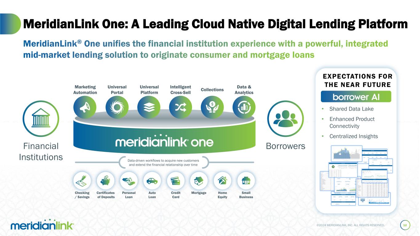 ©2024 MERIDIANLINK, INC. ALL RIGHTS RESERVED. MeridianLink One: A Leading Cloud Native Digital Lending Platform 12 MeridianLink® One unifies the financial institution experience with a powerful, integrated mid-market lending solution to originate consumer and mortgage loans Financial Institutions Borrowers Marketing Automation Universal Portal Universal Platform Intelligent Cross-Sell Collections Data & Analytics Checking / Savings Certificates of Deposits Personal Loan Auto Loan Credit Card Mortgage Home Equity Small Business Data-driven workflows to acquire new customers and extend the financial relationship over time • Shared Data Lake • Enhanced Product Connectivity • Centralized Insights EXPECTATIONS FOR THE NEAR FUTURE
