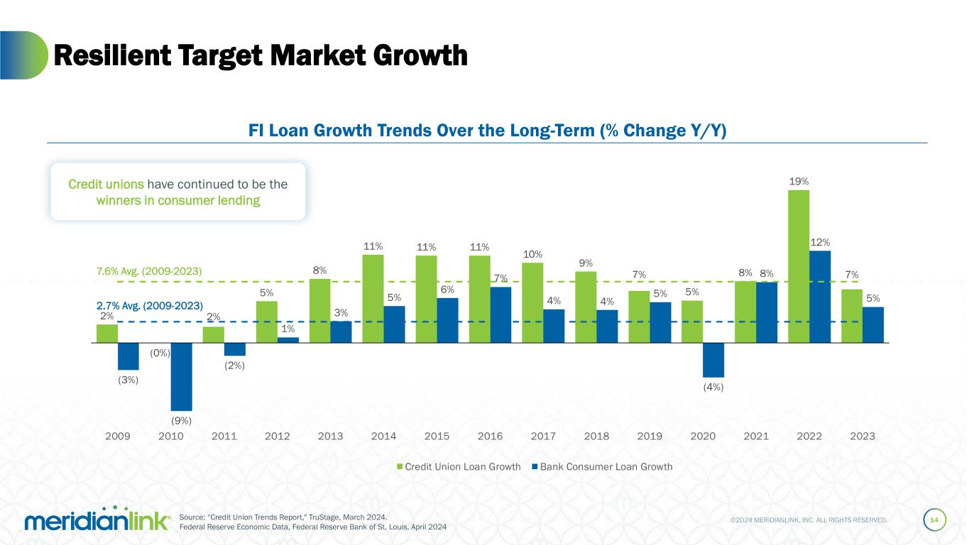 ©2024 MERIDIANLINK, INC. ALL RIGHTS RESERVED. Multi-Vector Growth Strategy 13 Multiple actionable initiatives to accelerate growth Paper-to-Digital Transition in Target Market Key Customer Themes Underpinning Growth Pursue Unrealized Upsell & Cross-Sell Expand Product Offerings Enhance Partner Marketplace Monetization Robust Pipeline of M&A Opportunities Add New Logos Capitalize on Organic Volume Growth Competition Among Financial Institutions