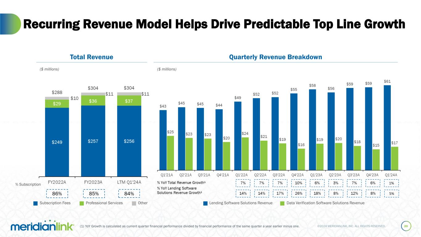 ©2024 MERIDIANLINK, INC. ALL RIGHTS RESERVED. Financial Highlights 19 • Recurring Revenue Model Helps Drive Predictable YoY Growth1 • Strong Non-GAAP Free Cash Flow Conversion and Generation5 • Efficient Operating Model with Strong Unit Economics, Generating Positive Adj. EBITDA4 • Continued Investment in Operations to Drive Future Growth3 • Lending Solutions Software: Attractive Growth Engine2 Note: Adj. EBITDA, non-GAAP free cash flow and non-GAAP operating income are non-GAAP measures. For a definition and reconciliation of non-GAAP adj. EBITDA, free cash flow and operating income, please refer to the Appendix. FCF Conversion refers to non-GAAP free cash flow / non-GAAP operating income.