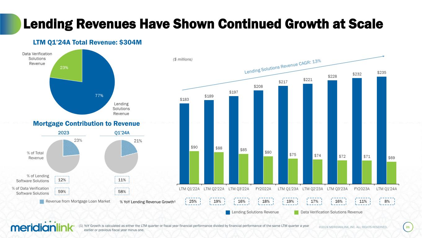 ©2024 MERIDIANLINK, INC. ALL RIGHTS RESERVED. Recurring Revenue Model Helps Drive Predictable Top Line Growth 20 Total Revenue Quarterly Revenue Breakdown ($ millions) ($ millions) % Subscription Professional Services OtherSubscription Fees Lending Software Solutions Revenue Data Verification Software Solutions Revenue (1) YoY Growth is calculated as current quarter financial performance divided by financial performance of the same quarter a year earlier minus one.