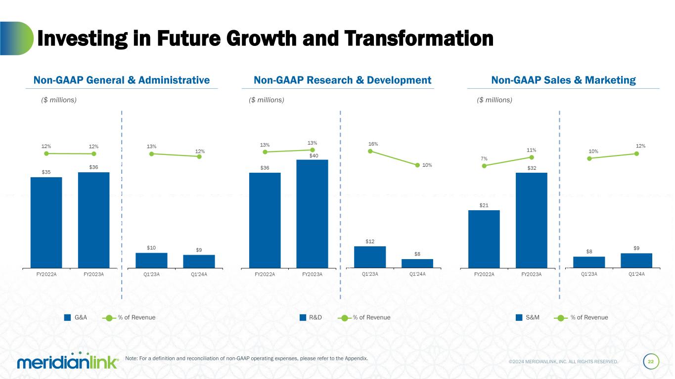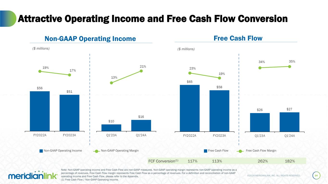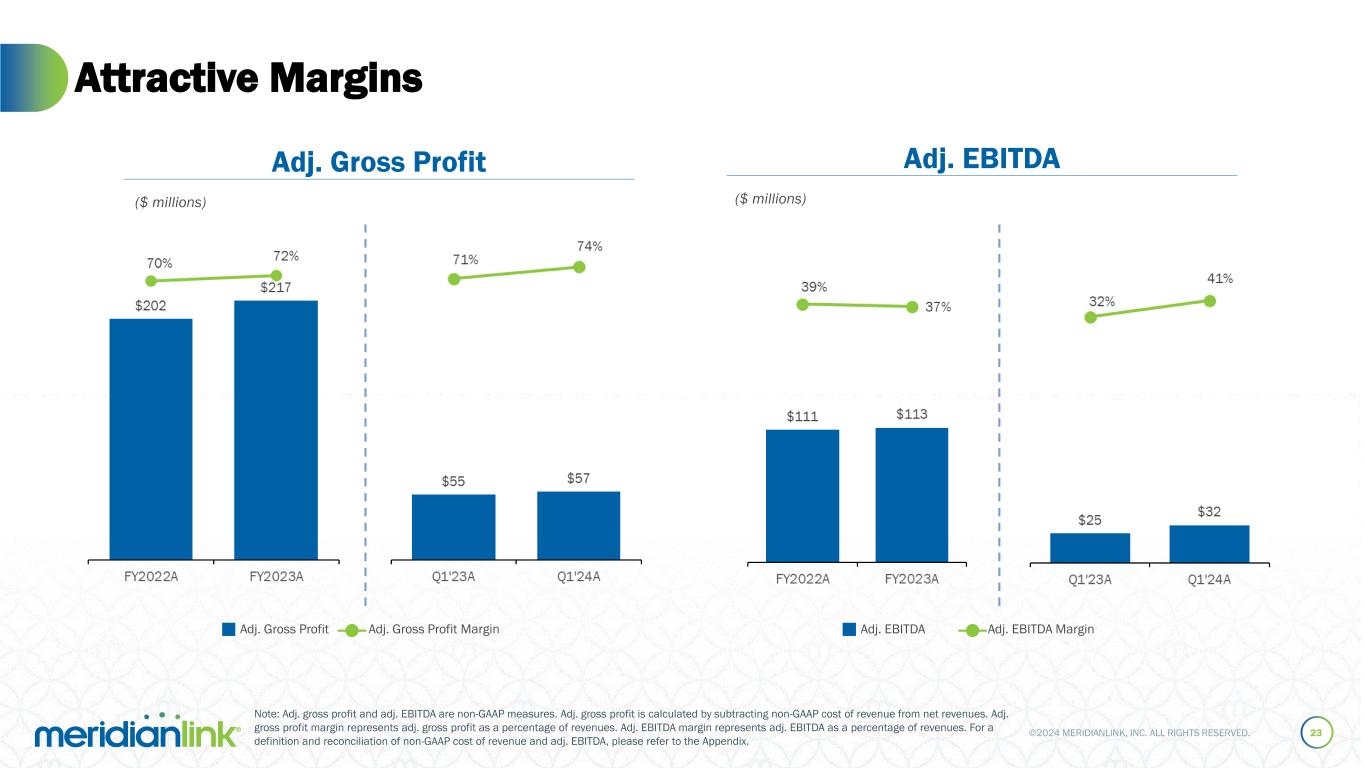 ©2024 MERIDIANLINK, INC. ALL RIGHTS RESERVED. Investing in Future Growth and Transformation 22 Non-GAAP General & Administrative Non-GAAP Research & Development Non-GAAP Sales & Marketing ($ millions) ($ millions) ($ millions) S&M % of RevenueR&D % of RevenueG&A % of Revenue Note: For a definition and reconciliation of non-GAAP operating expenses, please refer to the Appendix.