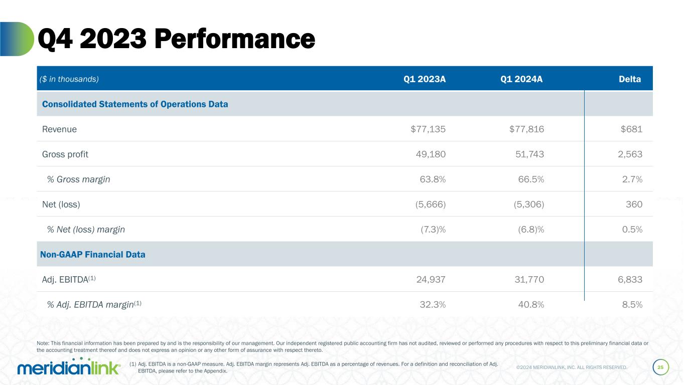 ©2024 MERIDIANLINK, INC. ALL RIGHTS RESERVED. Q4 2023 Performance 25 ($ in thousands) Q1 2023A Q1 2024A Delta Consolidated Statements of Operations Data Revenue $77,135 $77,816 $681 Gross profit 49,180 51,743 2,563 % Gross margin 63.8% 66.5% 2.7% Net (loss) (5,666) (5,306) 360 % Net (loss) margin (7.3)% (6.8)% 0.5% Non-GAAP Financial Data Adj. EBITDA(1) 24,937 31,770 6,833 % Adj. EBITDA margin(1) 32.3% 40.8% 8.5% Note: This financial information has been prepared by and is the responsibility of our management. Our independent registered public accounting firm has not audited, reviewed or performed any procedures with respect to this preliminary financial data or the accounting treatment thereof and does not express an opinion or any other form of assurance with respect thereto. (1) Adj. EBITDA is a non-GAAP measure. Adj. EBITDA margin represents Adj. EBITDA as a percentage of revenues. For a definition and reconciliation of Adj. EBITDA, please refer to the Appendix.