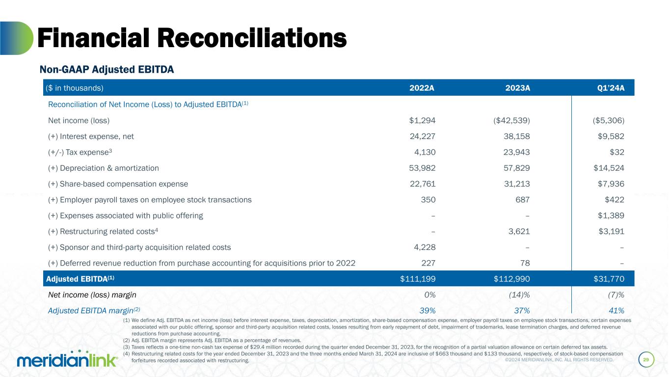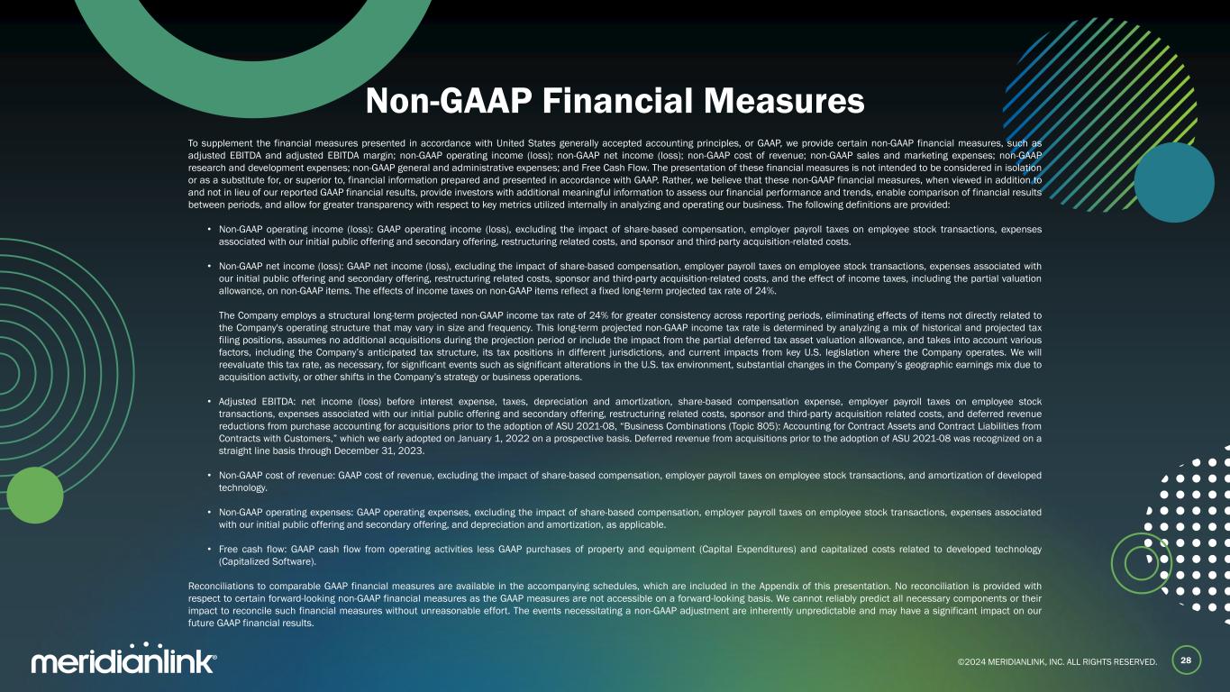 ©2024 MERIDIANLINK, INC. ALL RIGHTS RESERVED.©2024 MERIDIA LINK, INC. ALL IGHTS RESERVED. Non-GAAP Financial Measures 28 To supplement the financial measures presented in accordance with United States generally accepted accounting principles, or GAAP, we provide certain non-GAAP financial measures, such as adjusted EBITDA and adjusted EBITDA margin; non-GAAP operating income (loss); non-GAAP net income (loss); non-GAAP cost of revenue; non-GAAP sales and marketing expenses; non-GAAP research and development expenses; non-GAAP general and administrative expenses; and Free Cash Flow. The presentation of these financial measures is not intended to be considered in isolation or as a substitute for, or superior to, financial information prepared and presented in accordance with GAAP. Rather, we believe that these non-GAAP financial measures, when viewed in addition to and not in lieu of our reported GAAP financial results, provide investors with additional meaningful information to assess our financial performance and trends, enable comparison of financial results between periods, and allow for greater transparency with respect to key metrics utilized internally in analyzing and operating our business. The following definitions are provided: • Non-GAAP operating income (loss): GAAP operating income (loss), excluding the impact of share-based compensation, employer payroll taxes on employee stock transactions, expenses associated with our initial public offering and secondary offering, restructuring related costs, and sponsor and third-party acquisition-related costs. • Non-GAAP net income (loss): GAAP net income (loss), excluding the impact of share-based compensation, employer payroll taxes on employee stock transactions, expenses associated with our initial public offering and secondary offering, restructuring related costs, sponsor and third-party acquisition-related costs, and the effect of income taxes, including the partial valuation allowance, on non-GAAP items. The effects of income taxes on non-GAAP items reflect a fixed long-term projected tax rate of 24%. The Company employs a structural long-term projected non-GAAP income tax rate of 24% for greater consistency across reporting periods, eliminating effects of items not directly related to the Company's operating structure that may vary in size and frequency. This long-term projected non-GAAP income tax rate is determined by analyzing a mix of historical and projected tax filing positions, assumes no additional acquisitions during the projection period or include the impact from the partial deferred tax asset valuation allowance, and takes into account various factors, including the Company’s anticipated tax structure, its tax positions in different jurisdictions, and current impacts from key U.S. legislation where the Company operates. We will reevaluate this tax rate, as necessary, for significant events such as significant alterations in the U.S. tax environment, substantial changes in the Company’s geographic earnings mix due to acquisition activity, or other shifts in the Company’s strategy or business operations. • Adjusted EBITDA: net income (loss) before interest expense, taxes, depreciation and amortization, share-based compensation expense, employer payroll taxes on employee stock transactions, expenses associated with our initial public offering and secondary offering, restructuring related costs, sponsor and third-party acquisition related costs, and deferred revenue reductions from purchase accounting for acquisitions prior to the adoption of ASU 2021-08, “Business Combinations (Topic 805): Accounting for Contract Assets and Contract Liabilities from Contracts with Customers,” which we early adopted on January 1, 2022 on a prospective basis. Deferred revenue from acquisitions prior to the adoption of ASU 2021-08 was recognized on a straight line basis through December 31, 2023. • Non-GAAP cost of revenue: GAAP cost of revenue, excluding the impact of share-based compensation, employer payroll taxes on employee stock transactions, and amortization of developed technology. • Non-GAAP operating expenses: GAAP operating expenses, excluding the impact of share-based compensation, employer payroll taxes on employee stock transactions, expenses associated with our initial public offering and secondary offering, and depreciation and amortization, as applicable. • Free cash flow: GAAP cash flow from operating activities less GAAP purchases of property and equipment (Capital Expenditures) and capitalized costs related to developed technology (Capitalized Software). Reconciliations to comparable GAAP financial measures are available in the accompanying schedules, which are included in the Appendix of this presentation. No reconciliation is provided with respect to certain forward-looking non-GAAP financial measures as the GAAP measures are not accessible on a forward-looking basis. We cannot reliably predict all necessary components or their impact to reconcile such financial measures without unreasonable effort. The events necessitating a non-GAAP adjustment are inherently unpredictable and may have a significant impact on our future GAAP financial results.