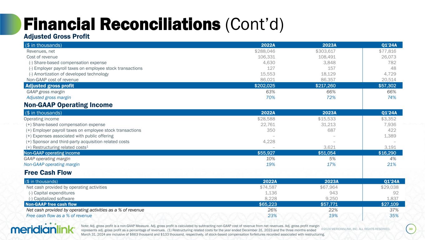 ©2024 MERIDIANLINK, INC. ALL RIGHTS RESERVED. Financial Reconciliations 29 ($ in thousands) 2022A 2023A Q1’24A Reconciliation of Net Income (Loss) to Adjusted EBITDA(1) Net income (loss) $1,294 ($42,539) ($5,306) (+) Interest expense, net 24,227 38,158 $9,582 (+/-) Tax expense3 4,130 23,943 $32 (+) Depreciation & amortization 53,982 57,829 $14,524 (+) Share-based compensation expense 22,761 31,213 $7,936 (+) Employer payroll taxes on employee stock transactions 350 687 $422 (+) Expenses associated with public offering – – $1,389 (+) Restructuring related costs4 – 3,621 $3,191 (+) Sponsor and third-party acquisition related costs 4,228 – – (+) Deferred revenue reduction from purchase accounting for acquisitions prior to 2022 227 78 – Adjusted EBITDA(1) $111,199 $112,990 $31,770 Net income (loss) margin 0% (14)% (7)% Adjusted EBITDA margin(2) 39% 37% 41% Non-GAAP Adjusted EBITDA (1) We define Adj. EBITDA as net income (loss) before interest expense, taxes, depreciation, amortization, share-based compensation expense, employer payroll taxes on employee stock transactions, certain expenses associated with our public offering, sponsor and third-party acquisition related costs, losses resulting from early repayment of debt, impairment of trademarks, lease termination charges, and deferred revenue reductions from purchase accounting. (2) Adj. EBITDA margin represents Adj. EBITDA as a percentage of revenues. (3) Taxes reflects a one-time non-cash tax expense of $29.4 million recorded during the quarter ended December 31, 2023, for the recognition of a partial valuation allowance on certain deferred tax assets. (4) Restructuring related costs for the year ended December 31, 2023 and the three months ended March 31, 2024 are inclusive of $663 thousand and $133 thousand, respectively, of stock-based compensation forfeitures recorded associated with restructuring.
