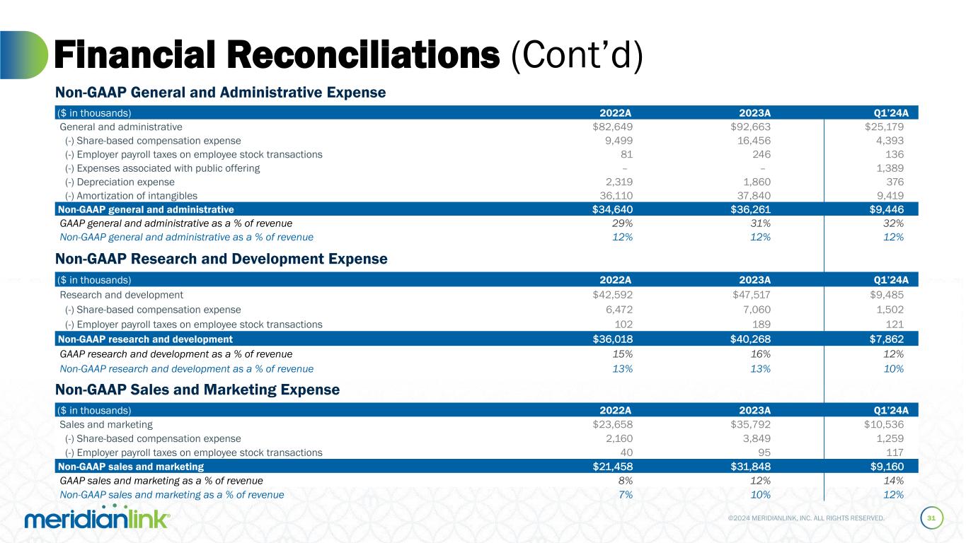 ©2024 MERIDIANLINK, INC. ALL RIGHTS RESERVED. Financial Reconciliations (Cont’d) 30 ($ in thousands) 2022A 2023A Q1’24A Revenues, net $288,046 $303,617 $77,816 Cost of revenue 106,331 108,491 26,073 (-) Share-based compensation expense 4,630 3,848 782 (-) Employer payroll taxes on employee stock transactions 127 157 48 (-) Amortization of developed technology 15,553 18,129 4,729 Non-GAAP cost of revenue 86,021 86,357 20,514 Adjusted gross profit $202,025 $217,260 $57,302 GAAP gross margin 63% 66% 66% Adjusted gross margin 70% 72% 74% Adjusted Gross Profit ($ in thousands) 2022A 2023A Q1’24A Operating income $28,588 $15,533 $3,352 (+) Share-based compensation expense 22,761 31,213 7,936 (+) Employer payroll taxes on employee stock transactions 350 687 422 (+) Expenses associated with public offering – – 1,389 (+) Sponsor and third-party acquisition related costs 4,228 – – (+) Restructuring related costs1 – 3,621 3,191 Non-GAAP operating income $55,927 $51,054 $16,290 GAAP operating margin 10% 5% 4% Non-GAAP operating margin 19% 17% 21% Non-GAAP Operating Income Note: Adj. gross profit is a non-GAAP Measure. Adj. gross profit is calculated by subtracting non-GAAP cost of revenue from net revenues. Adj. gross profit margin represents adj. gross profit as a percentage of revenues. (1) Restructuring related costs for the year ended December 31, 2023 and the three months ended March 31, 2024 are inclusive of $663 thousand and $133 thousand, respectively, of stock-based compensation forfeitures recorded associated with restructuring. ($ in thousands) 2022A 2023A Q1’24A Net cash provided by operating activities $74,587 $67,964 $29,038 (-) Capital expenditures 1,136 943 92 (-) Capitalized software 8,228 9,250 1,837 Non-GAAP free cash flow $65,223 $57,771 $27,109 Net cash provided by operating activities as a % of revenue 26% 22% 37% Free cash flow as a % of revenue 23% 19% 35% Free Cash Flow