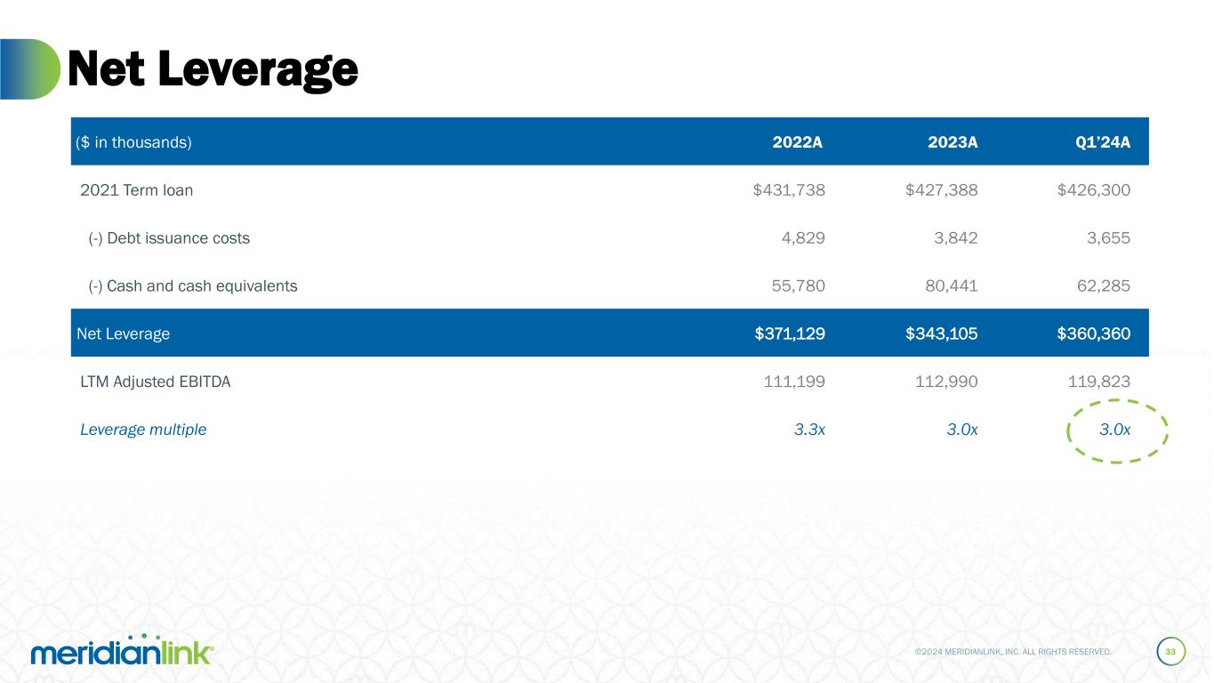 ©2024 MERIDIANLINK, INC. ALL RIGHTS RESERVED. Balance Sheet Highlights 32 ($ in thousands) 2022A 2023A Q1’24A Total current assets $128,132 $124,427 $111,146 Property and equipment, net 4,245 3,337 3,011 Intangible assets, net 297,475 251,060 238,818 Goodwill 608,657 610,063 610,063 Other assets 20,648 7,364 7,462 Total assets $1,059,157 $996,251 $970,500 Total current liabilities $54,199 $55,844 $73,730 Long-term debt, net of debt issuance costs 423,404 420,004 419,102 Other liabilities 2,463 12,156 11,335 Total liabilities $480,066 $488,004 $504,167 Total stockholders’ equity 579,091 508,247 466,333 Total liabilities and stockholders’ equity $1,059,157 $996,251 $970,500