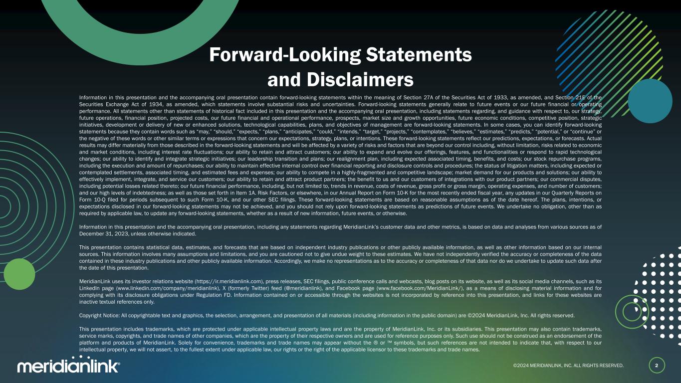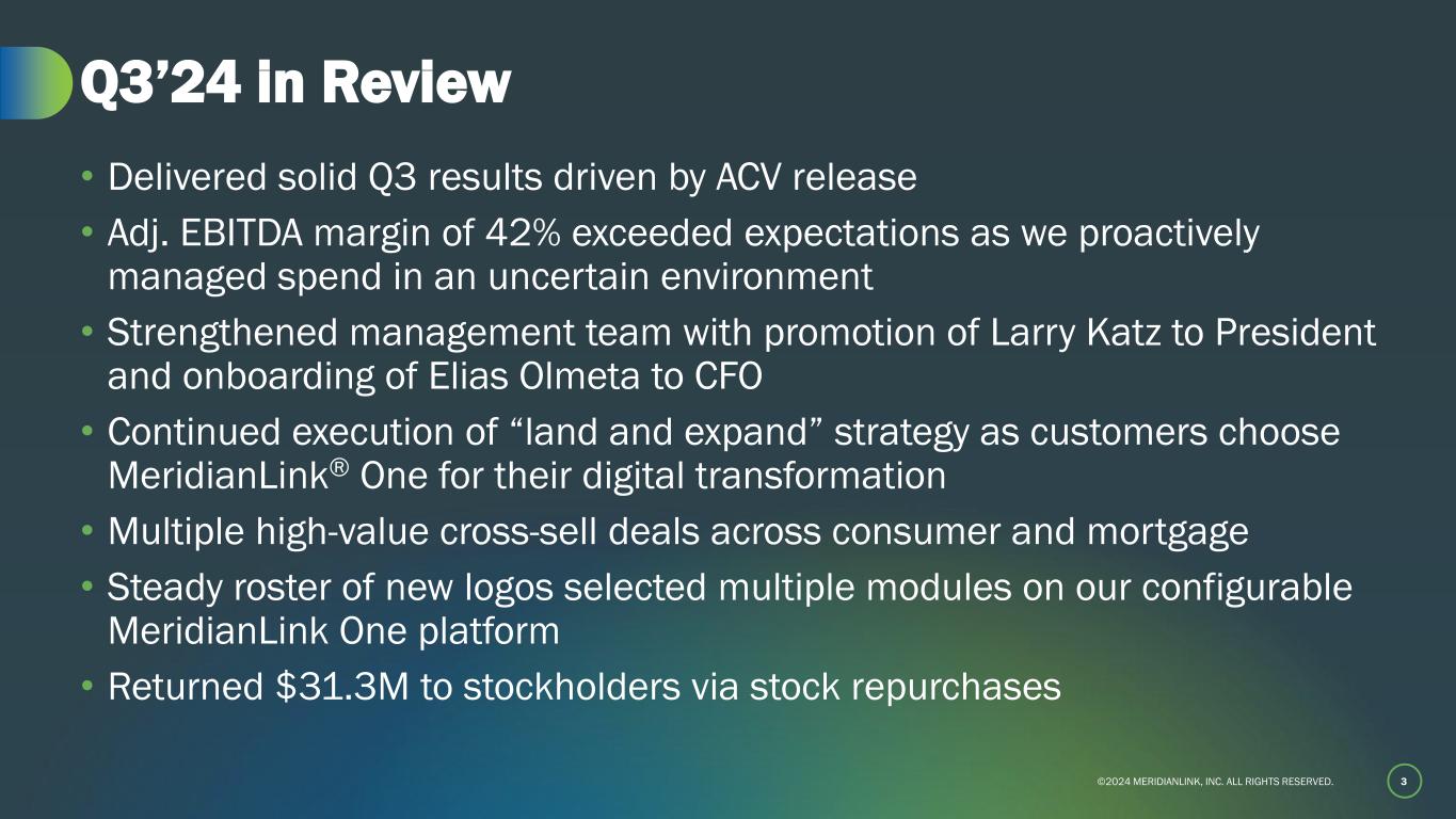 ©2024 MERIDIANLINK, INC. ALL RIGHTS RESERVED. Forward-Looking Statements and Disclaimers 2 Information in this presentation and the accompanying oral presentation contain forward-looking statements within the meaning of Section 27A of the Securities Act of 1933, as amended, and Section 21E of the Securities Exchange Act of 1934, as amended, which statements involve substantial risks and uncertainties. Forward-looking statements generally relate to future events or our future financial or operating performance. All statements other than statements of historical fact included in this presentation and the accompanying oral presentation, including statements regarding, and guidance with respect to, our strategy, future operations, financial position, projected costs, our future financial and operational performance, prospects, market size and growth opportunities, future economic conditions, competitive position, strategic initiatives, development or delivery of new or enhanced solutions, technological capabilities, plans, and objectives of management are forward-looking statements. In some cases, you can identify forward-looking statements because they contain words such as “may,” “should,” “expects,” “plans,” “anticipates,” “could,” “intends,” “target,” “projects,” “contemplates,” “believes,” “estimates,” “predicts,” “potential,” or “continue” or the negative of these words or other similar terms or expressions that concern our expectations, strategy, plans, or intentions. These forward-looking statements reflect our predictions, expectations, or forecasts. Actual results may differ materially from those described in the forward-looking statements and will be affected by a variety of risks and factors that are beyond our control including, without limitation, risks related to economic and market conditions, including interest rate fluctuations; our ability to retain and attract customers; our ability to expand and evolve our offerings, features, and functionalities or respond to rapid technological changes; our ability to identify and integrate strategic initiatives; our leadership transition and plans; our realignment plan, including expected associated timing, benefits, and costs; our stock repurchase programs, including the execution and amount of repurchases; our ability to maintain effective internal control over financial reporting and disclosure controls and procedures; the status of litigation matters, including expected or contemplated settlements, associated timing, and estimated fees and expenses; our ability to compete in a highly-fragmented and competitive landscape; market demand for our products and solutions; our ability to effectively implement, integrate, and service our customers; our ability to retain and attract product partners; the benefit to us and our customers of integrations with our product partners; our commercial disputes, including potential losses related thereto; our future financial performance, including, but not limited to, trends in revenue, costs of revenue, gross profit or gross margin, operating expenses, and number of customers; and our high levels of indebtedness; as well as those set forth in Item 1A. Risk Factors, or elsewhere, in our Annual Report on Form 10-K for the most recently ended fiscal year, any updates in our Quarterly Reports on Form 10-Q filed for periods subsequent to such Form 10-K, and our other SEC filings. These forward-looking statements are based on reasonable assumptions as of the date hereof. The plans, intentions, or expectations disclosed in our forward-looking statements may not be achieved, and you should not rely upon forward-looking statements as predictions of future events. We undertake no obligation, other than as required by applicable law, to update any forward-looking statements, whether as a result of new information, future events, or otherwise. Information in this presentation and the accompanying oral presentation, including any statements regarding MeridianLink’s customer data and other metrics, is based on data and analyses from various sources as of December 31, 2023, unless otherwise indicated. This presentation contains statistical data, estimates, and forecasts that are based on independent industry publications or other publicly available information, as well as other information based on our internal sources. This information involves many assumptions and limitations, and you are cautioned not to give undue weight to these estimates. We have not independently verified the accuracy or completeness of the data contained in these industry publications and other publicly available information. Accordingly, we make no representations as to the accuracy or completeness of that data nor do we undertake to update such data after the date of this presentation. MeridianLink uses its investor relations website (https://ir.meridianlink.com), press releases, SEC filings, public conference calls and webcasts, blog posts on its website, as well as its social media channels, such as its LinkedIn page (www.linkedin.com/company/meridianlink), X (formerly Twitter) feed (@meridianlink), and Facebook page (www.facebook.com/MeridianLink/), as a means of disclosing material information and for complying with its disclosure obligations under Regulation FD. Information contained on or accessible through the websites is not incorporated by reference into this presentation, and links for these websites are inactive textual references only. Copyright Notice: All copyrightable text and graphics, the selection, arrangement, and presentation of all materials (including information in the public domain) are ©2024 MeridianLink, Inc. All rights reserved. This presentation includes trademarks, which are protected under applicable intellectual property laws and are the property of MeridianLink, Inc. or its subsidiaries. This presentation may also contain trademarks, service