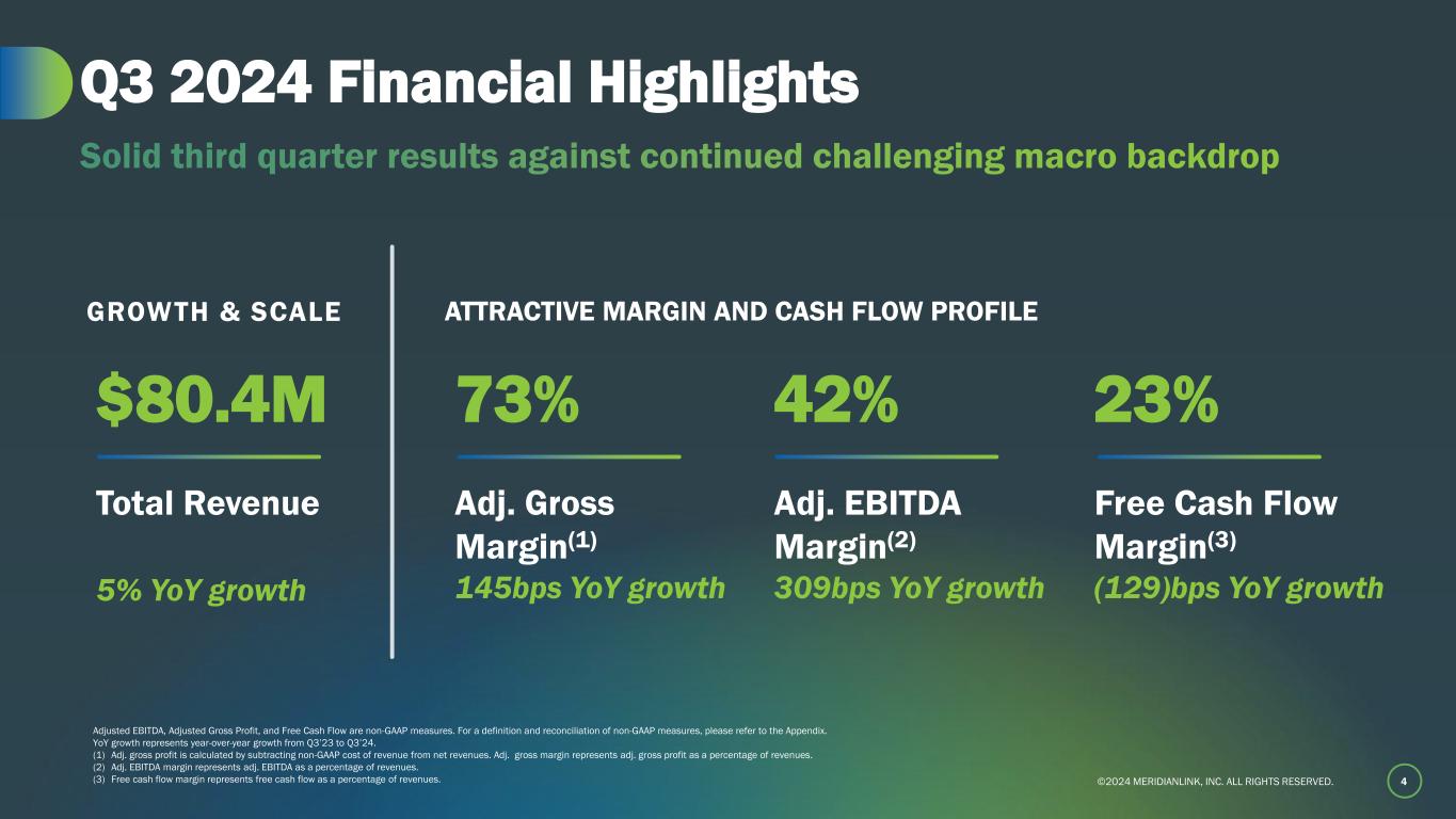 ©2024 MERIDIANLINK, INC. ALL RIGHTS RESERVED. 3 Q3’24 in Review • Delivered solid Q3 results driven by ACV release • Adj. EBITDA margin of 42% exceeded expectations as we proactively managed spend in an uncertain environment • Strengthened management team with promotion of Larry Katz to President and onboarding of Elias Olmeta to CFO • Continued execution of “land and expand” strategy as customers choose MeridianLink® One for their digital transformation • Multiple high-value cross-sell deals across consumer and mortgage • Steady roster of new logos selected multiple modules on our configurable MeridianLink One platform • Returned $31.3M to stockholders via stock repurchases