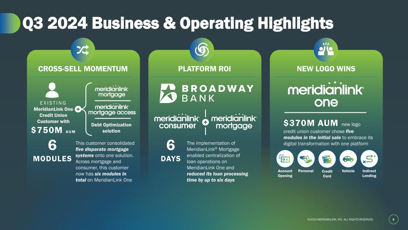 ©2024 MERIDIANLINK, INC. ALL RIGHTS RESERVED. 4 Q3 2024 Financial Highlights Solid third quarter results against continued challenging macro backdrop Adjusted EBITDA, Adjusted Gross Profit, and Free Cash Flow are non-GAAP measures. For a definition and reconciliation of non-GAAP measures, please refer to the Appendix. YoY growth represents year-over-year growth from Q3’23 to Q3’24. (1) Adj. gross profit is calculated by subtracting non-GAAP cost of revenue from net revenues. Adj. gross margin represents adj. gross profit as a percentage of revenues. (2) Adj. EBITDA margin represents adj. EBITDA as a percentage of revenues. (3) Free cash flow margin represents free cash flow as a percentage of revenues. $80.4M Total Revenue 5% YoY growth 23% Free Cash Flow Margin(3) (129)bps YoY growth 73% Adj. Gross Margin(1) 145bps YoY growth 42% Adj. EBITDA Margin(2) 309bps YoY growth GROWTH & SCALE ATTRACTIVE MARGIN AND CASH FLOW PROFILE