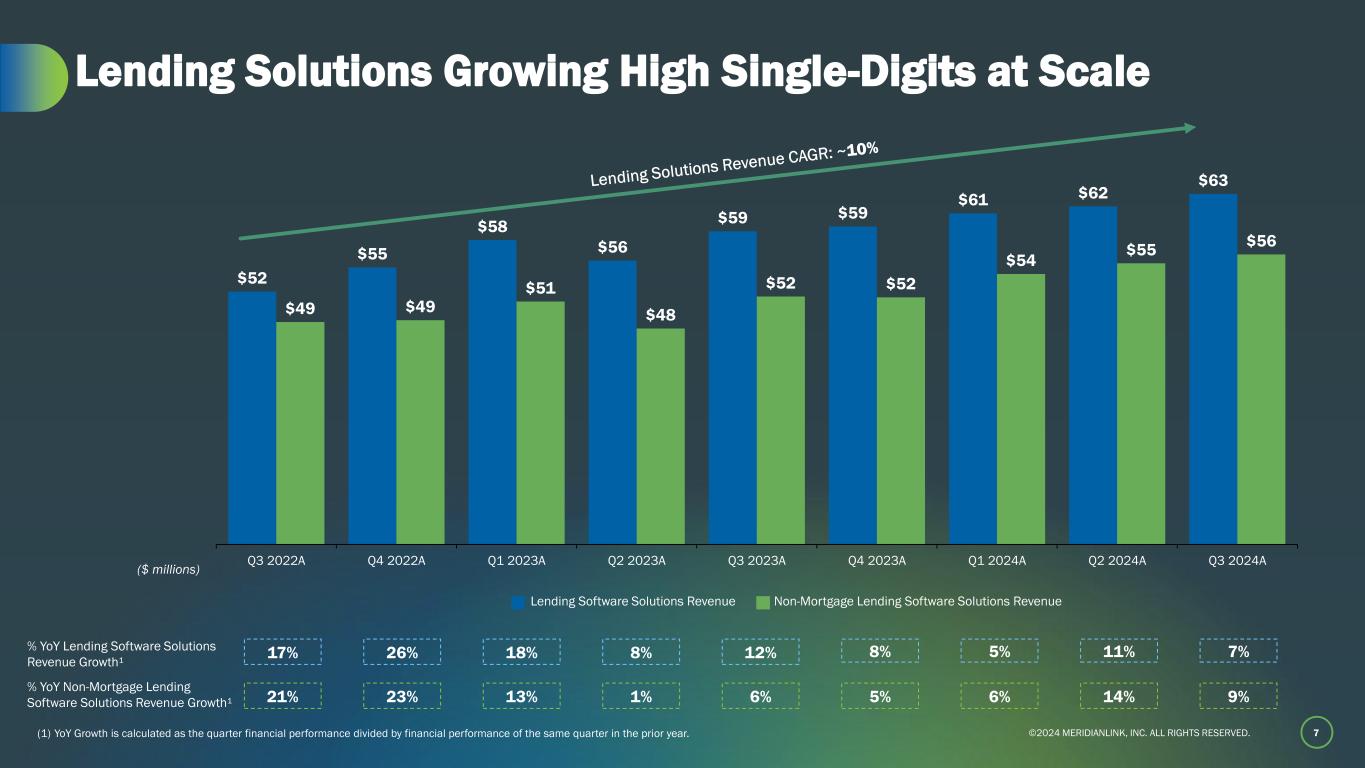 ©2024 MERIDIANLINK, INC. ALL RIGHTS RESERVED. % Mortgage $8 $8 $10 $10 Q3'23A Q3'24A 56%57% $18 $17 $52 $56 $7 $7 Q3'23A Q3'24A 10%12% $59 $63 $65 $67 $9 $10 $3 $3 Q3'23A Q3'24A 84%84% $76 $80 6 Q3 2024 Revenue Drivers Revenue by Source ($ millions) % Subscription Professional Services OtherSubscription Fees Lending Software Solutions Data Verification Software Solutions % Mortgage MortgageNon-Mortgage MortgageNon-Mortgage Revenue by Solution Type Note: Financial data as of the three months ended September 30th, 2023 or September 30th, 2024 as noted. Subtotals may not add to totals due to rounding.