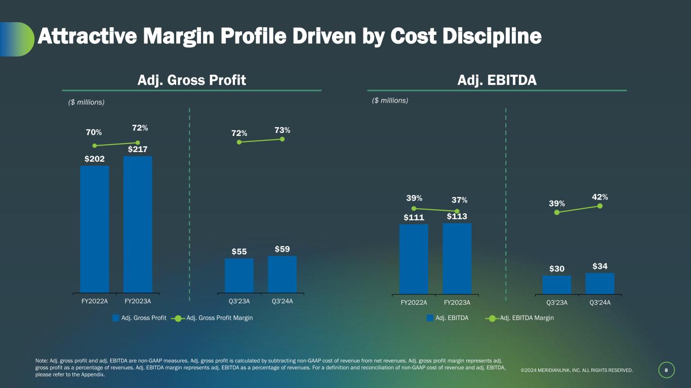 ©2024 MERIDIANLINK, INC. ALL RIGHTS RESERVED. $52 $55 $58 $56 $59 $59 $61 $62 $63 $49 $49 $51 $48 $52 $52 $54 $55 $56 Q3 2022A Q4 2022A Q1 2023A Q2 2023A Q3 2023A Q4 2023A Q1 2024A Q2 2024A Q3 2024A 7 Lending Solutions Growing High Single-Digits at Scale Lending Software Solutions Revenue Non-Mortgage Lending Software Solutions Revenue % YoY Non-Mortgage Lending Software Solutions Revenue Growth¹ ($ millions) (1) YoY Growth is calculated as the quarter financial performance divided by financial performance of the same quarter in the prior year. % YoY Lending Software Solutions Revenue Growth¹ 21% 23% 13% 1% 6% 5% 6% 14% 17% 26% 18% 8% 12% 8% 5% 11% 9% 7%