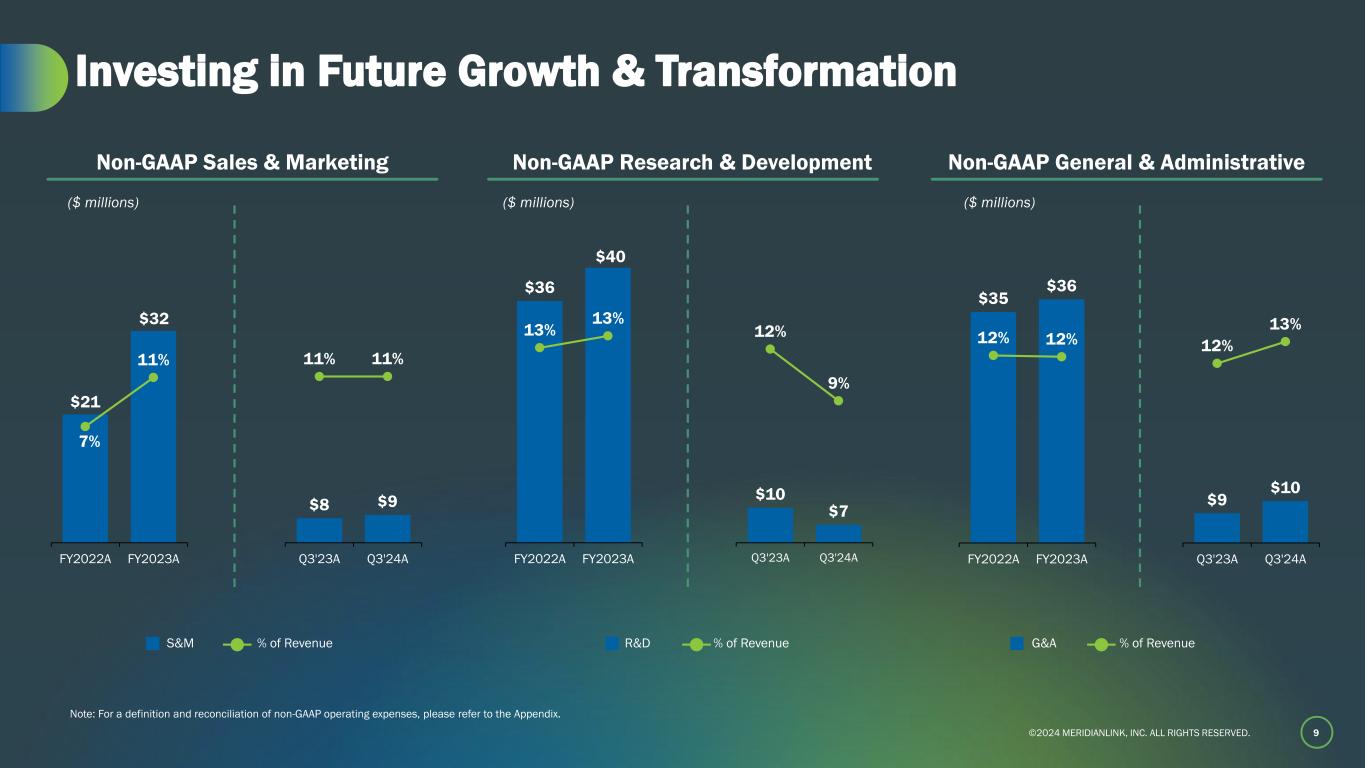 ©2024 MERIDIANLINK, INC. ALL RIGHTS RESERVED. $30 $34 39% 42% Q3'23A Q3'24A $55 $59 72% 73% Q3'23A Q3'24A 8 Attractive Margin Profile Driven by Cost Discipline Adj. Gross Profit ($ millions) Adj. EBITDA ($ millions) Adj. EBITDA Adj. EBITDA Margin Note: Adj. gross profit and adj. EBITDA are non-GAAP measures. Adj. gross profit is calculated by subtracting non-GAAP cost of revenue from net revenues. Adj. gross profit margin represents adj. gross profit as a percentage of revenues. Adj. EBITDA margin represents adj. EBITDA as a percentage of revenues. For a definition and reconciliation of non-GAAP cost of revenue and adj. EBITDA, please refer to the Appendix. Adj. Gross Profit Adj. Gross Profit Margin $111 $113 39% 37% FY2022A FY2023A $202 $217 70% 72% FY2022A FY2023A