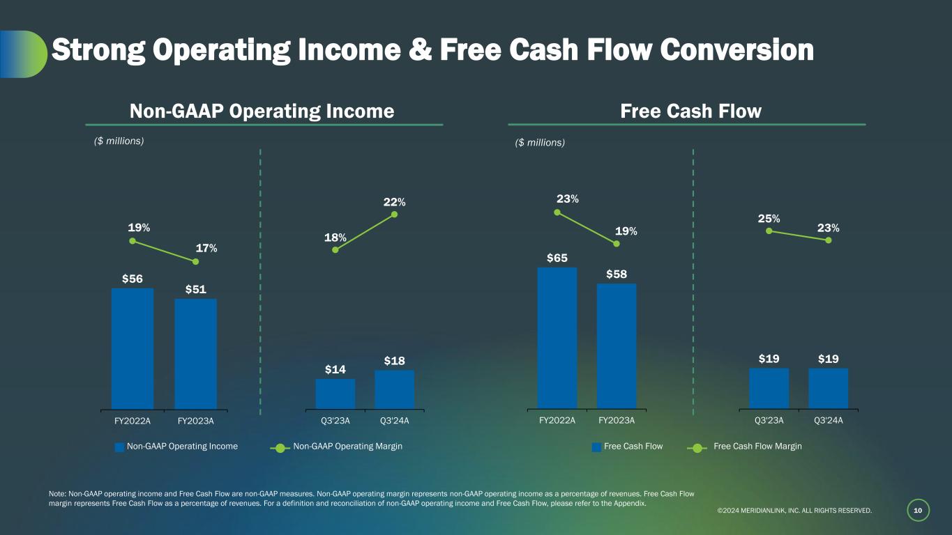 ©2024 MERIDIANLINK, INC. ALL RIGHTS RESERVED. $9 $10 12% 13% Q3'23A Q3'24A $10 $7 12% 9% Q3'23A Q3'24A $8 $9 11% 11% Q3'23A Q3'24A $35 $36 12% 12% FY2022A FY2023A 9 Investing in Future Growth & Transformation Non-GAAP Research & DevelopmentNon-GAAP Sales & Marketing ($ millions)($ millions) S&M % of Revenue R&D % of Revenue Note: For a definition and reconciliation of non-GAAP operating expenses, please refer to the Appendix. Non-GAAP General & Administrative ($ millions) G&A % of Revenue $21 $32 7% 11% FY2022A FY2023A $36 $40 13% 13% FY2022A FY2023A