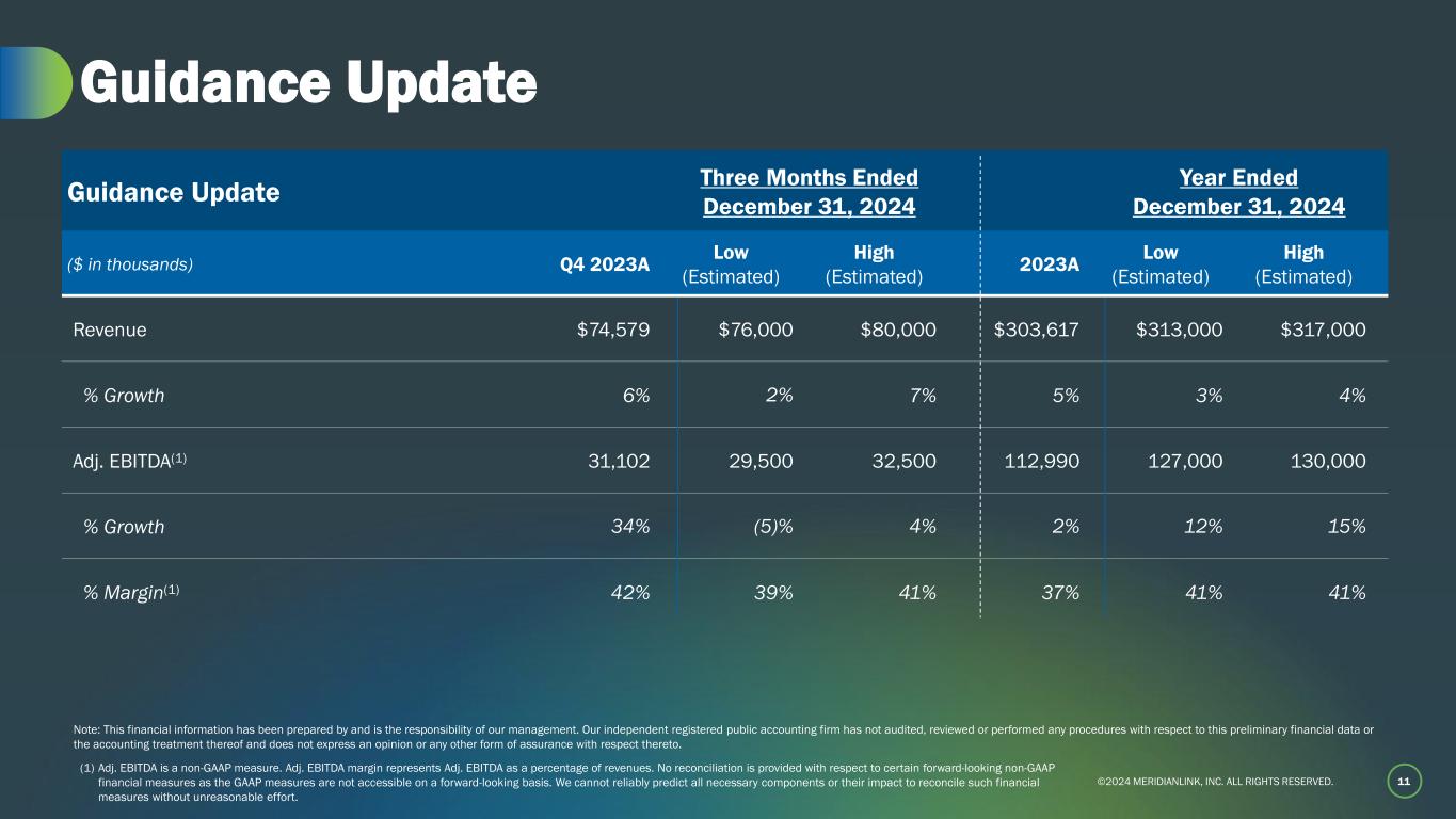 ©2024 MERIDIANLINK, INC. ALL RIGHTS RESERVED. $19 $19 25% 23% Q3'23A Q3'24A $14 $18 18% 22% Q3'23A Q3'24A Note: Non-GAAP operating income and Free Cash Flow are non-GAAP measures. Non-GAAP operating margin represents non-GAAP operating income as a percentage of revenues. Free Cash Flow margin represents Free Cash Flow as a percentage of revenues. For a definition and reconciliation of non-GAAP operating income and Free Cash Flow, please refer to the Appendix. 10 Strong Operating Income & Free Cash Flow Conversion Non-GAAP Operating Income Free Cash Flow ($ millions) Non-GAAP Operating Income Non-GAAP Operating Margin Free Cash Flow Free Cash Flow Margin ($ millions) $56 $51 19% 17% FY2022A FY2023A $65 $58 23% 19% FY2022A FY2023A