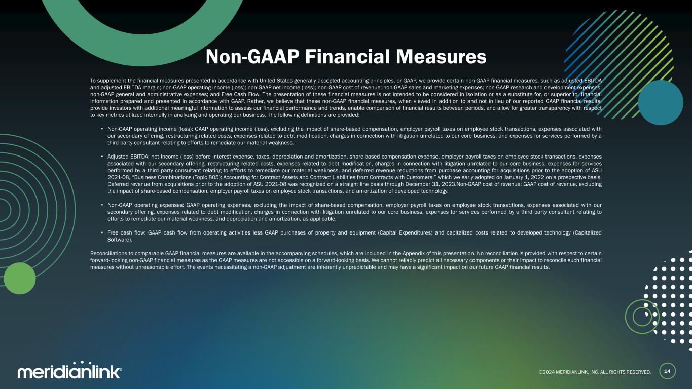 ©2024 MERIDIANLINK, INC. ALL RIGHTS RESERVED. 13 Q3 2024 Performance ($ in thousands) Q3 2023A Q3 2024A Delta Consolidated Statements of Operations Data Revenue $76,488 $80,369 $3,881 Gross profit 49,476 52,719 3,243 % Gross margin 64.7% 65.6% 0.9% Net (loss) (2,069) (7,051) (4,982) % Net (loss) margin (2.7)% (8.8)% (6.1)% Non-GAAP Financial Data Adj. EBITDA(1) 29,835 33,829 3,994 % Adj. EBITDA margin(1) 39.0% 42.1% 3.1% Free cash flow(2) 18,817 18,735 (82) % Free cash flow margin(2) 24.6% 23.3% (1.3)% Note: This financial information has been prepared by and is the responsibility of our management. Our independent registered public accounting firm has not audited, reviewed or performed any procedures with respect to this preliminary financial data or the accounting treatment thereof and does not express an opinion or any other form of assurance with respect thereto. (1) Adj. EBITDA is a non-GAAP measure. Adj. EBITDA margin represents Adj. EBITDA as a percentage of revenues. For a definition and reconciliation of Adj. EBITDA, please refer to the Appendix. (2) Free cash flow is a non-GAAP measure. Free cash flow margin represents free cash flow as a percentage of revenues. For a definition and reconciliation of free cash flow, please refer to the Appendix.