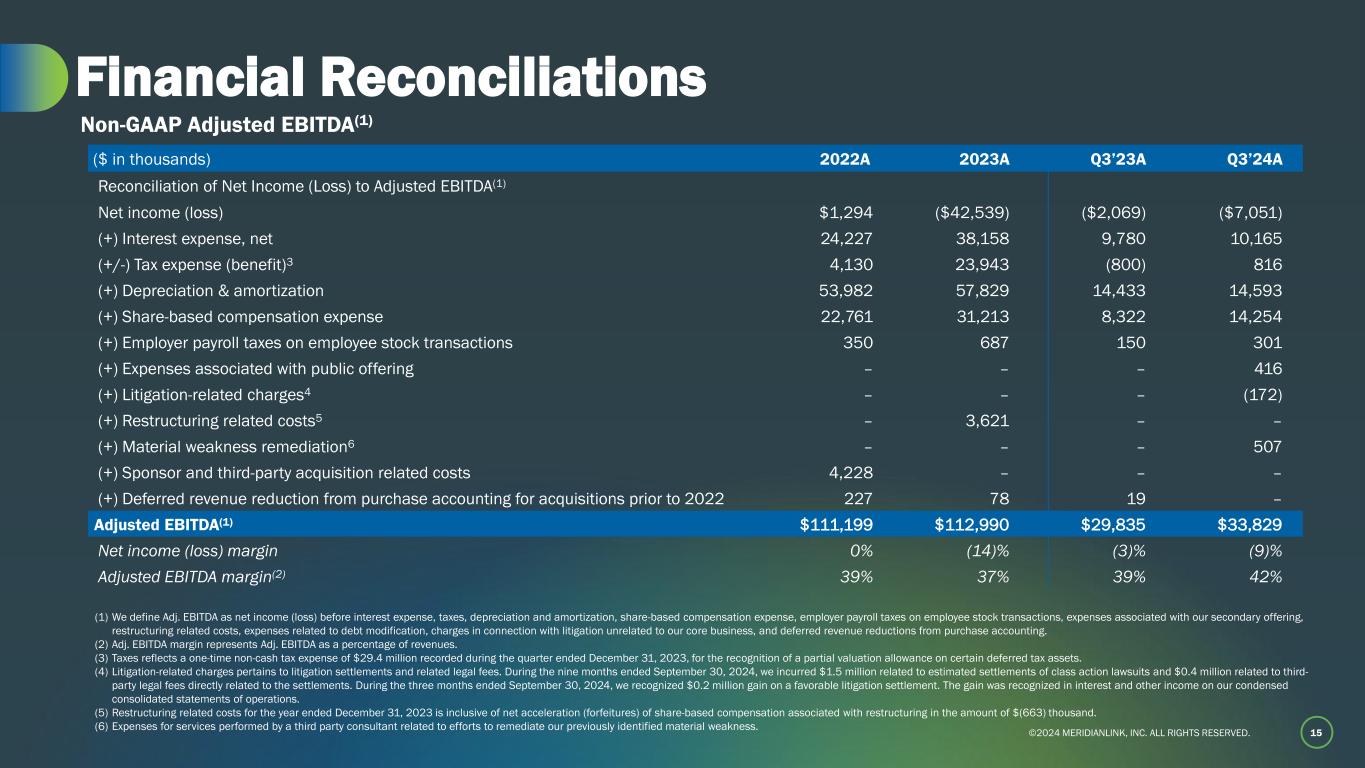 ©2024 MERIDIANLINK, INC. ALL RIGHTS RESERVED.©2024 MERIDIA LINK, INC. ALL IGHTS RESERVED. Non-GAAP Financial Measures 14 To supplement the financial measures presented in accordance with United States generally accepted accounting principles, or GAAP, we provide certain non-GAAP financial measures, such as adjusted EBITDA and adjusted EBITDA margin; non-GAAP operating income (loss); non-GAAP net income (loss); non-GAAP cost of revenue; non-GAAP sales and marketing expenses; non-GAAP research and development expenses; non-GAAP general and administrative expenses; and Free Cash Flow. The presentation of these financial measures is not intended to be considered in isolation or as a substitute for, or superior to, financial information prepared and presented in accordance with GAAP. Rather, we believe that these non-GAAP financial measures, when viewed in addition to and not in lieu of our reported GAAP financial results, provide investors with additional meaningful information to assess our financial performance and trends, enable comparison of financial results between periods, and allow for greater transparency with respect to key metrics utilized internally in analyzing and operating our business. The following definitions are provided: • Non-GAAP operating income (loss): GAAP operating income (loss), excluding the impact of share-based compensation, employer payroll taxes on employee stock transactions, expenses associated with our secondary offering, restructuring related costs, expenses related to debt modification, charges in connection with litigation unrelated to our core business, and expenses for services performed by a third party consultant relating to efforts to remediate our material weakness. • Adjusted EBITDA: net income (loss) before interest expense, taxes, depreciation and amortization, share-based compensation expense, employer payroll taxes on employee stock transactions, expenses associated with our secondary offering, restructuring related costs, expenses related to debt modification, charges in connection with litigation unrelated to our core business, expenses for services performed by a third party consultant relating to efforts to remediate our material weakness, and deferred revenue reductions from purchase accounting for acquisitions prior to the adoption of ASU 2021-08, “Business Combinations (Topic 805): Accounting for Contract Assets and Contract Liabilities from Contracts with Customers,” which we early adopted on January 1, 2022 on a prospective basis. Deferred revenue from acquisitions prior to the adoption of ASU 2021-08 was recognized on a straight line basis through December 31, 2023.Non-GAAP cost of revenue: GAAP cost of revenue, excluding the impact of share-based compensation, employer payroll taxes on employee stock transactions, and amortization of developed technology. • Non-GAAP operating expenses: GAAP operating expenses, excluding the impact of share-based compensation, employer payroll taxes on employee stock transactions, expenses associated with our secondary offering, expenses related to debt modification, charges in connection with litigation unrelated to our core business, expenses for services performed by a third party consultant relating to efforts to remediate our material weakness, and depreciation and amortization, as applicable. • Free cash flow: GAAP cash flow from operating activities less GAAP purchases of property and equipment (Capital Expenditures) and capitalized costs related to developed technology (Capitalized Software). Reconciliations to comparable GAAP financial measures are available in the accompanying schedules, which are included in the Appendix of this presentation. No reconciliation is provided with respect to certain forward-looking non-GAAP financial measures as the GAAP measures are not accessible on a forward-looking basis. We cannot reliably predict all necessary components or their impact to reconcile such financial measures without unreasonable effort. The events necessitating a non-GAAP adjustment are inherently unpredictable and may have a significant impact on our future GAAP financial results.