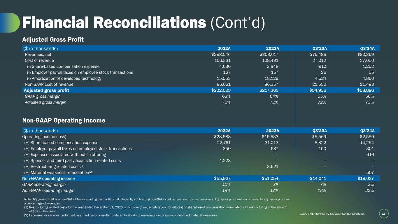 ©2024 MERIDIANLINK, INC. ALL RIGHTS RESERVED. 15 Financial Reconciliations ($ in thousands) 2022A 2023A Q3’23A Q3’24A Reconciliation of Net Income (Loss) to Adjusted EBITDA(1) Net income (loss) $1,294 ($42,539) ($2,069) ($7,051) (+) Interest expense, net 24,227 38,158 9,780 10,165 (+/-) Tax expense (benefit)3 4,130 23,943 (800) 816 (+) Depreciation & amortization 53,982 57,829 14,433 14,593 (+) Share-based compensation expense 22,761 31,213 8,322 14,254 (+) Employer payroll taxes on employee stock transactions 350 687 150 301 (+) Expenses associated with public offering – – – 416 (+) Litigation-related charges4 – – – (172) (+) Restructuring related costs5 – 3,621 – – (+) Material weakness remediation6 – – – 507 (+) Sponsor and third-party acquisition related costs 4,228 – – – (+) Deferred revenue reduction from purchase accounting for acquisitions prior to 2022 227 78 19 – Adjusted EBITDA(1) $111,199 $112,990 $29,835 $33,829 Net income (loss) margin 0% (14)% (3)% (9)% Adjusted EBITDA margin(2) 39% 37% 39% 42% Non-GAAP Adjusted EBITDA(1) (1) We define Adj. EBITDA as net income (loss) before interest expense, taxes, depreciation and amortization, share-based compensation expense, employer payroll taxes on employee stock transactions, expenses associated with our secondary offering, restructuring related costs, expenses related to debt modification, charges in connection with litigation unrelated to our core business, and deferred revenue reductions from purchase accounting. (2) Adj. EBITDA margin represents Adj. EBITDA as a percentage of revenues. (3) Taxes reflects a one-time non-cash tax expense of $29.4 million recorded during the quarter ended December 31, 2023, for the recognition of a partial valuation allowance on certain deferred tax assets. (4) Litigation-related charges pertains to litigation settlements and related legal fees. During the nine months ended September 30, 2024, we incurred $1.5 million related to estimated settlements of class action lawsuits and $0.4 million related to third- party legal fees directly related to the settlements. During the three months ended September 30, 2024, we recognized $0.2 million gain on a favorable litigation settlement. The gain was recognized in interest and other income on our condensed consolidated statements of operations. (5) Restructuring related costs for the year ended December 31, 2023 is inclusive of net acceleration (forfeitures) of share-based compensation associated with restructuring in the amount of $(663) thousand. (6) Expenses for services performed by a third party consultant related to efforts to remediate our previously identified material weakness.
