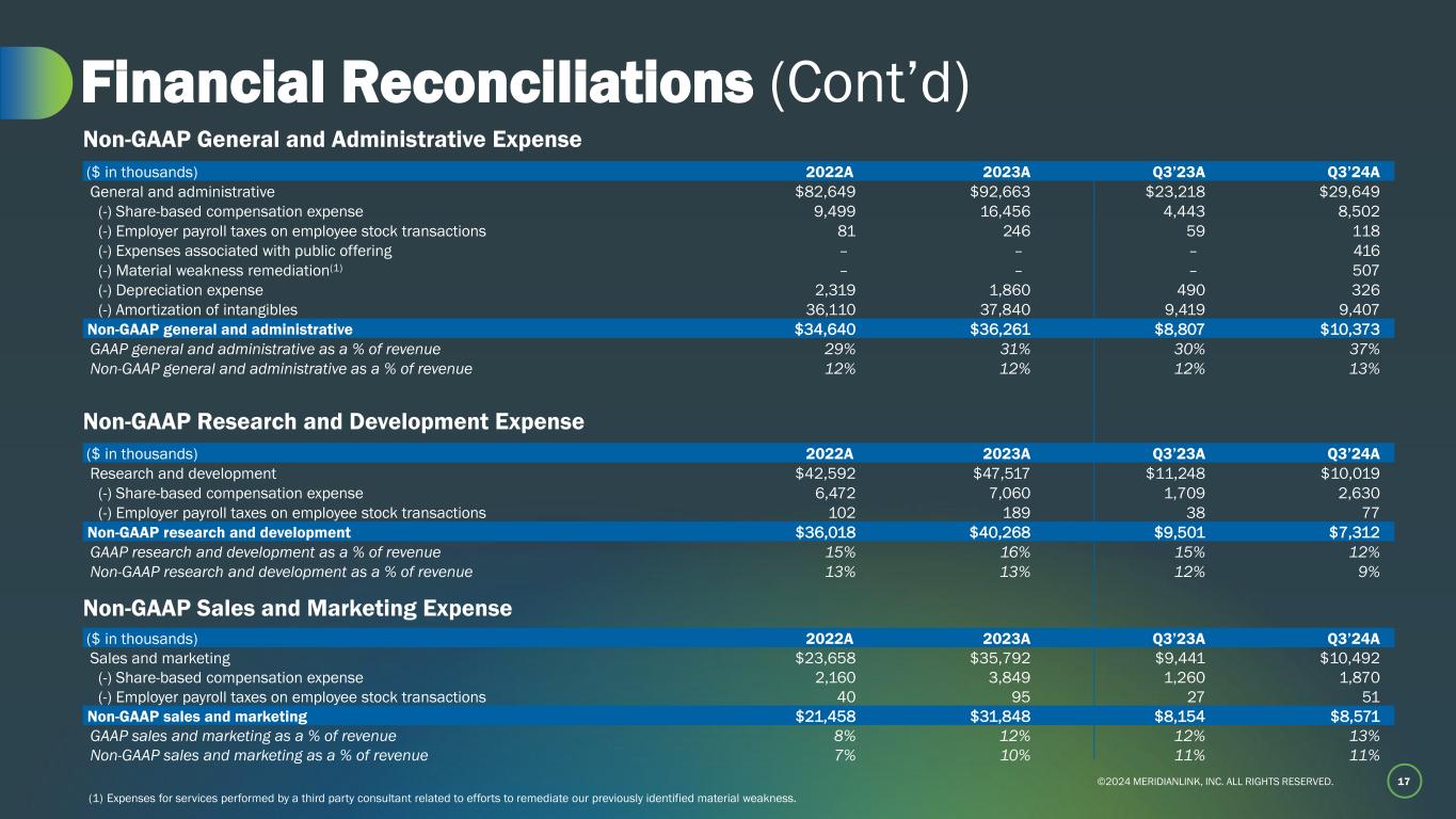 ©2024 MERIDIANLINK, INC. ALL RIGHTS RESERVED. 16 Financial Reconciliations (Cont’d) ($ in thousands) 2022A 2023A Q3’23A Q3’24A Revenues, net $288,046 $303,617 $76,488 $80,369 Cost of revenue 106,331 108,491 27,012 27,650 (-) Share-based compensation expense 4,630 3,848 910 1,252 (-) Employer payroll taxes on employee stock transactions 127 157 26 55 (-) Amortization of developed technology 15,553 18,129 4,524 4,860 Non-GAAP cost of revenue 86,021 86,357 21,552 21,483 Adjusted gross profit $202,025 $217,260 $54,936 $58,886 GAAP gross margin 63% 64% 65% 66% Adjusted gross margin 70% 72% 72% 73% Adjusted Gross Profit ($ in thousands) 2022A 2023A Q3’23A Q3’24A Operating income (loss) $28,588 $15,533 $5,569 $2,559 (+) Share-based compensation expense 22,761 31,213 8,322 14,254 (+) Employer payroll taxes on employee stock transactions 350 687 150 301 (+) Expenses associated with public offering – – – 416 (+) Sponsor and third-party acquisition related costs 4,228 – – – (+) Restructuring related costs(1) – 3,621 – – (+) Material weakness remediation(2) – – – 507 Non-GAAP operating income $55,927 $51,054 $14,041 $18,037 GAAP operating margin 10% 5% 7% 3% Non-GAAP operating margin 19% 17% 18% 22% Non-GAAP Operating Income Note: Adj. gross profit is a non-GAAP Measure. Adj. gross profit is calculated by subtracting non-GAAP cost of revenue from net revenues. Adj. gross profit margin represents adj. gross profit as a percentage of revenues. (1) Restructuring related costs for the year ended December 31, 2023 is inclusive of net acceleration (forfeitures) of share-based compensation associated with restructuring in the amount of $(663) thousand. (2) Expenses for services performed by a third party consultant related to efforts to remediate our previously identified material weakness.