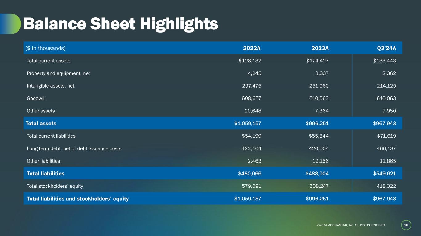 ©2024 MERIDIANLINK, INC. ALL RIGHTS RESERVED. 17 Financial Reconciliations (Cont’d) ($ in thousands) 2022A 2023A Q3’23A Q3’24A Sales and marketing $23,658 $35,792 $9,441 $10,492 (-) Share-based compensation expense 2,160 3,849 1,260 1,870 (-) Employer payroll taxes on employee stock transactions 40 95 27 51 Non-GAAP sales and marketing $21,458 $31,848 $8,154 $8,571 GAAP sales and marketing as a % of revenue 8% 12% 12% 13% Non-GAAP sales and marketing as a % of revenue 7% 10% 11% 11% Non-GAAP Sales and Marketing Expense ($ in thousands) 2022A 2023A Q3’23A Q3’24A Research and development $42,592 $47,517 $11,248 $10,019 (-) Share-based compensation expense 6,472 7,060 1,709 2,630 (-) Employer payroll taxes on employee stock transactions 102 189 38 77 Non-GAAP research and development $36,018 $40,268 $9,501 $7,312 GAAP research and development as a % of revenue 15% 16% 15% 12% Non-GAAP research and development as a % of revenue 13% 13% 12% 9% Non-GAAP Research and Development Expense ($ in thousands) 2022A 2023A Q3’23A Q3’24A General and administrative $82,649 $92,663 $23,218 $29,649 (-) Share-based compensation expense 9,499 16,456 4,443 8,502 (-) Employer payroll taxes on employee stock transactions 81 246 59 118 (-) Expenses associated with public offering – – – 416 (-) Material weakness remediation(1) – – – 507 (-) Depreciation expense 2,319 1,860 490 326 (-) Amortization of intangibles 36,110 37,840 9,419 9,407 Non-GAAP general and administrative $34,640 $36,261 $8,807 $10,373 GAAP general and administrative as a % of revenue 29% 31% 30% 37% Non-GAAP general and administrative as a % of revenue 12% 12% 12% 13% Non-GAAP General and Administrative Expense (1) Expenses for services performed by a third party consultant related to efforts to remediate our previously identified material weakness.