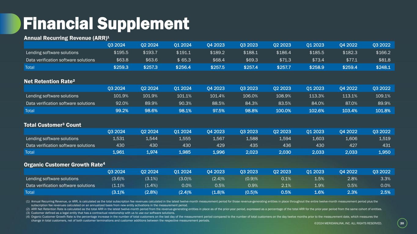 ©2024 MERIDIANLINK, INC. ALL RIGHTS RESERVED. 20 Financial Supplement Q3 2024 Q2 2024 Q1 2024 Q4 2023 Q3 2023 Q2 2023 Q1 2023 Q4 2022 Q3 2022 Lending software solutions $195.5 $193.7 $ 191.1 $189.2 $188.1 $186.4 $185.5 $182.3 $166.2 Data verification software solutions $63.8 $63.6 $ 65.3 $68.4 $69.3 $71.3 $73.4 $77.1 $81.8 Total $259.3 $257.3 $ 256.4 $257.5 $257.4 $257.7 $258.9 $259.4 $248.1 Annual Recurring Revenue (ARR)¹ Q3 2024 Q2 2024 Q1 2024 Q4 2023 Q3 2023 Q2 2023 Q1 2023 Q4 2022 Q3 2022 Lending software solutions 101.9% 101.9% 101.1% 101.4% 106.0% 108.9% 113.3% 113.1% 109.1% Data verification software solutions 92.0% 89.9% 90.3% 88.5% 84.3% 83.5% 84.0% 87.0% 89.9% Total 99.2% 98.6% 98.1% 97.5% 98.8% 100.0% 102.6% 103.4% 101.8% Net Retention Rate² Organic Customer Growth Rate4 Q3 2024 Q2 2024 Q1 2024 Q4 2023 Q3 2023 Q2 2023 Q1 2023 Q4 2022 Q3 2022 Lending software solutions 1,531 1,544 1,555 1,567 1,588 1,594 1,603 1,606 1,519 Data verification software solutions 430 430 430 429 435 436 430 427 431 Total 1,961 1,974 1,985 1,996 2,023 2,030 2,033 2,033 1,950 Total Customer³ Count Q3 2024 Q2 2024 Q1 2024 Q4 2023 Q3 2023 Q2 2023 Q1 2023 Q4 2022 Q3 2022 Lending software solutions (3.6)% (3.1%) (3.0)% (2.4)% (0.9)% 0.1% 1.5% 2.8% 3.3% Data verification software solutions (1.1)% (1.4%) 0.0% 0.5% 0.9% 2.1% 1.9% 0.5% 0.0% Total (3.1)% (2.8%) (2.4)% (1.8)% (0.5)% 0.5% 1.6% 2.3% 2.5% (1) Annual Recurring Revenue, or ARR, is calculated as the total subscription fee revenues calculated in the latest twelve-month measurement period for those revenue-generating entities in place throughout the entire twelve-month measurement period plus the subscription fee revenues calculated on an annualized basis from new entity activations in the measurement period. (2) ARR Net Retention Rate is calculated as the total ARR in the latest twelve-month period from the revenue-generating entities in place as of the prior-year period, expressed as a percentage of the total ARR for the prior-year period from the same cohort of entities. (3) Customer defined as a legal entity that has a contractual relationship with us to use our software solutions. (4) Organic Customer Growth Rate is the percentage increase in the number of total customers on the last day of the measurement period compared to the number of total customers on the day twelve months prior to the measurement date, which measures the change in total customers, net of both customer terminations and customer additions between the respective measurement periods.