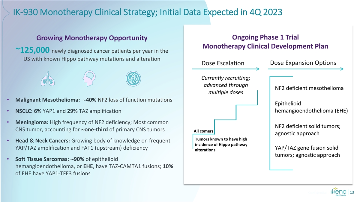 TEAD1 and VGLL4 are Highly Expressed in IK-930’s Initial Target Indications TEAD1 is the Most Highly Expressed Paralog Mesothelioma and EHE Have High Expression of VGLL4 in Mesothelioma and EHE TEAD1 TEAD2 TEAD3 TEAD4 Confidential 12 12 TEAD Paralog TPM VGLL4 TPM