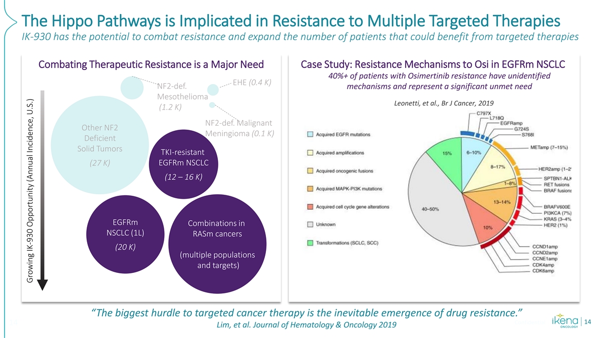 IK-930 Monotherapy Clinical Strategy; Initial Data Expected in 4Q 2023 Ongoing Phase 1 Trial Growing Monotherapy Opportunity Monotherapy Clinical Development Plan ~125,000 newly diagnosed cancer patients per year in the US with known Hippo pathway mutations and alteration Dose Expansion Options Dose Escalation Currently recruiting; advanced through NF2 deficient mesothelioma multiple doses • Malignant Mesothelioma: ~40% NF2 loss of function mutations Epithelioid hemangioendothelioma (EHE) • NSCLC: 6% YAP1 and 29% TAZ amplification • Meningioma: High frequency of NF2 deficiency; Most common NF2 deficient solid tumors; CNS tumor, accounting for ~one-third of primary CNS tumors All comers agnostic approach Tumors known to have high • Head & Neck Cancers: Growing body of knowledge on frequent incidence of Hippo pathway YAP/TAZ amplification and FAT1 (upstream) deficiency YAP/TAZ gene fusion solid alterations tumors; agnostic approach • Soft Tissue Sarcomas: ~90% of epithelioid hemangioendothelioma, or EHE, have TAZ-CAMTA1 fusions; 10% of EHE have YAP1-TFE3 fusions Confidential 13 13